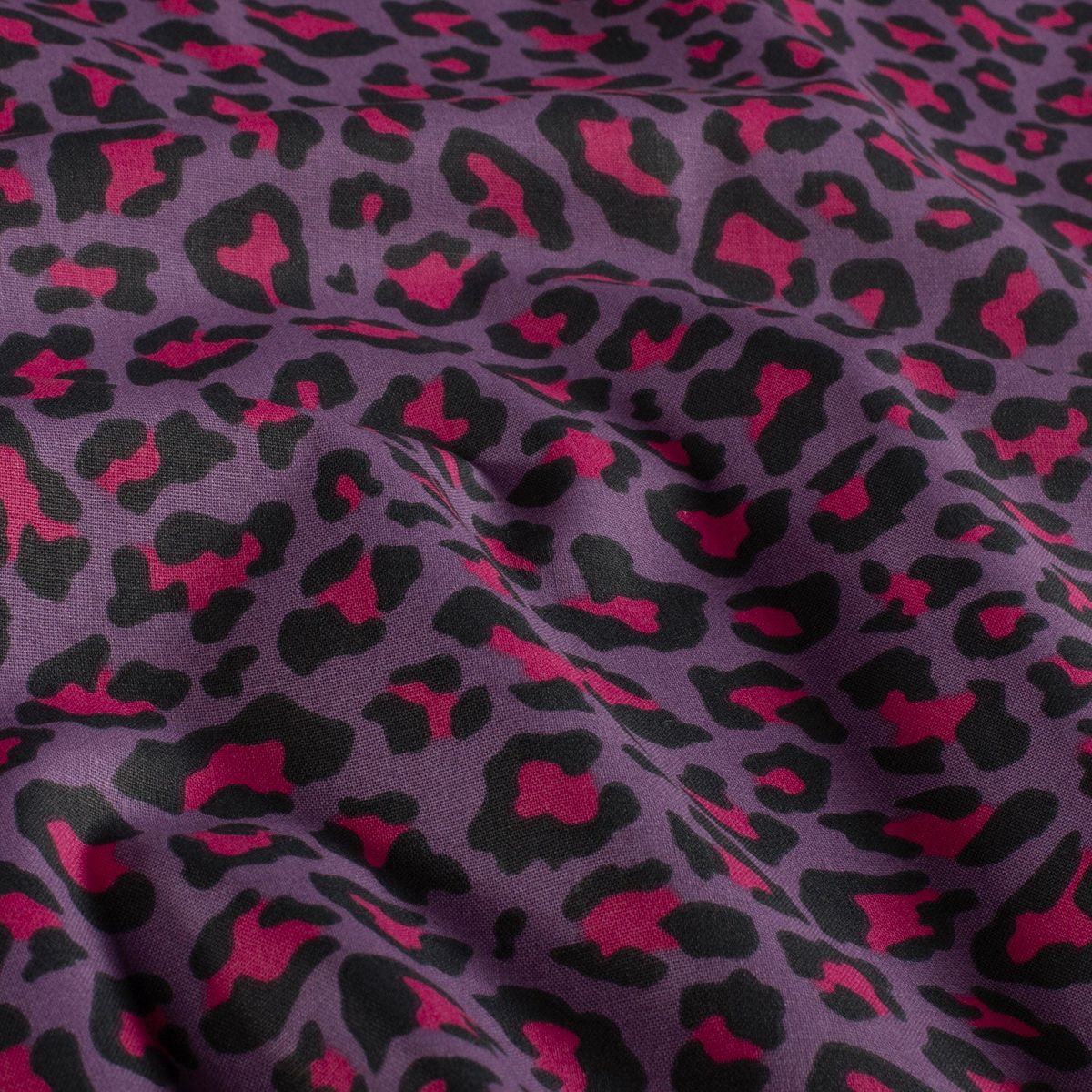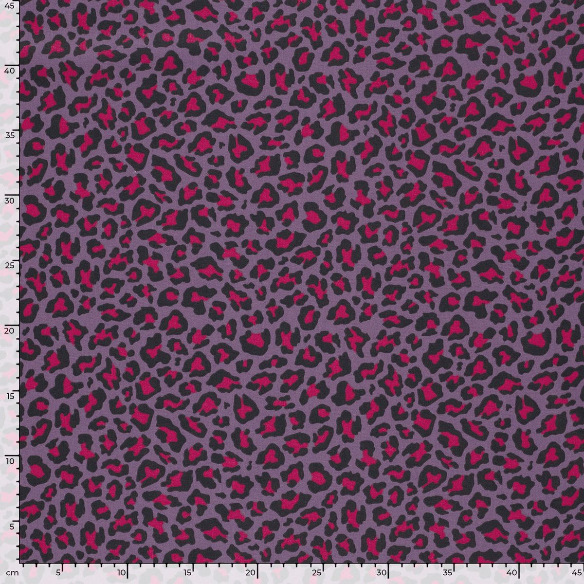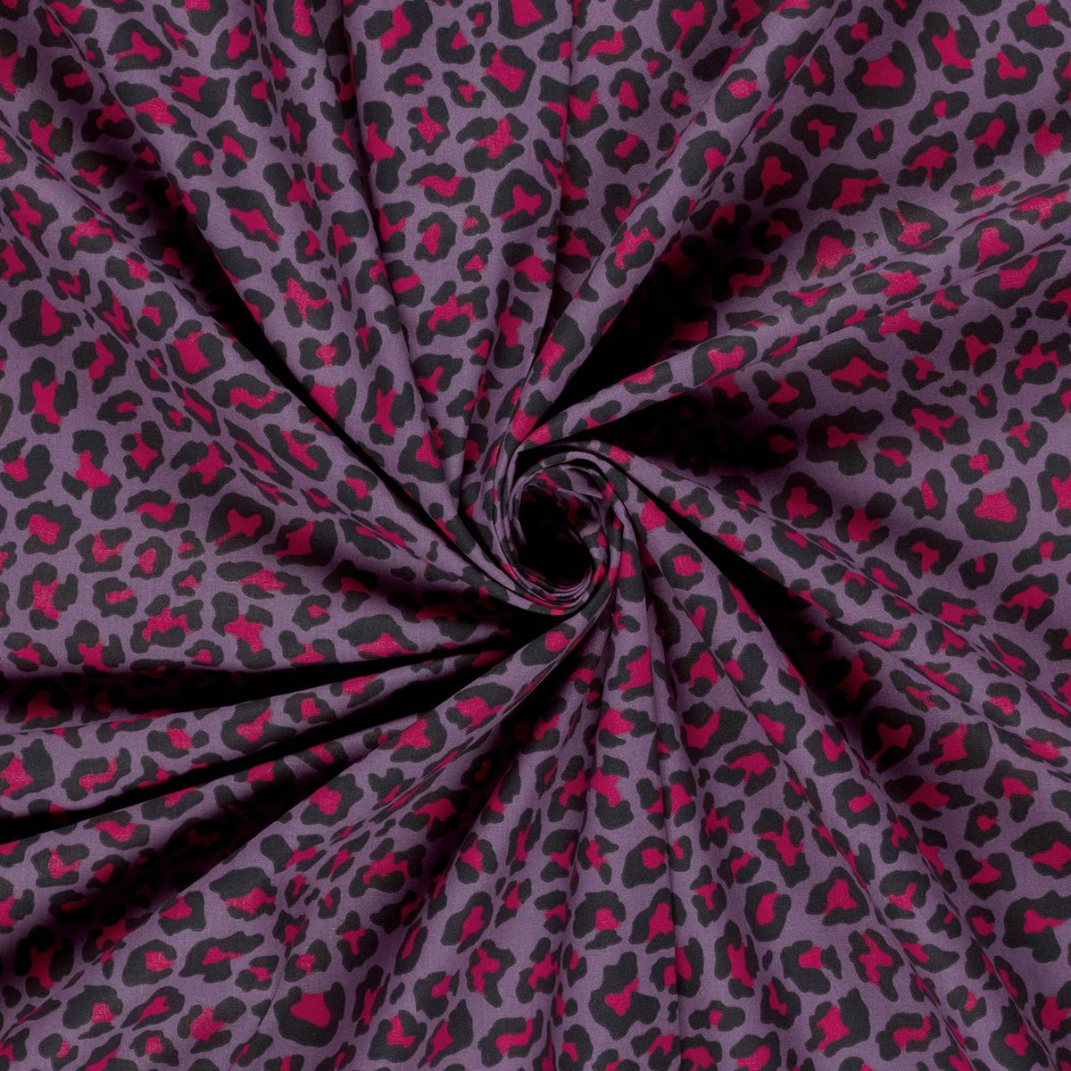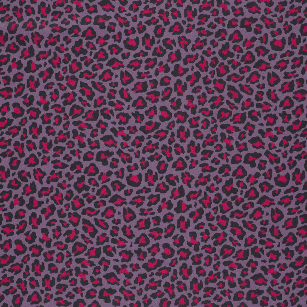 Modischer Baumwollstoff Popeline mit trendigem Leo-Muster in Lila, Pink und Schwarz für auffällige und kreative Nähideen