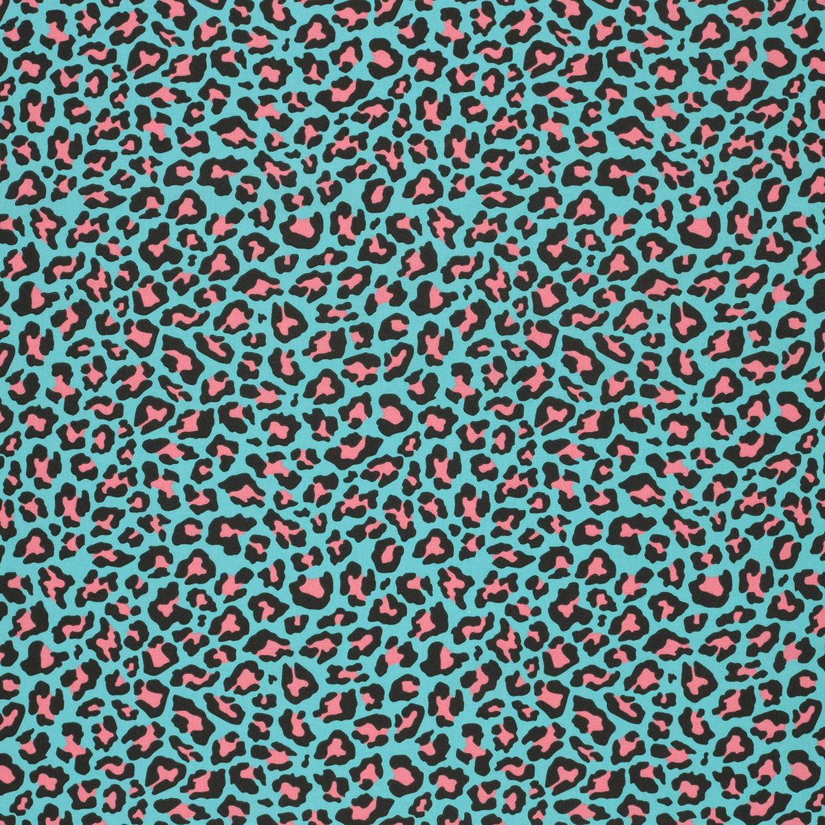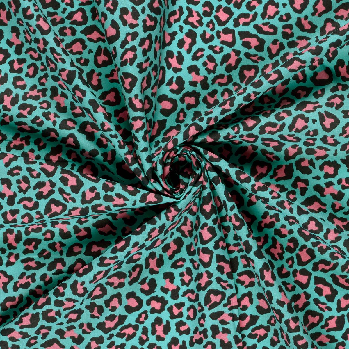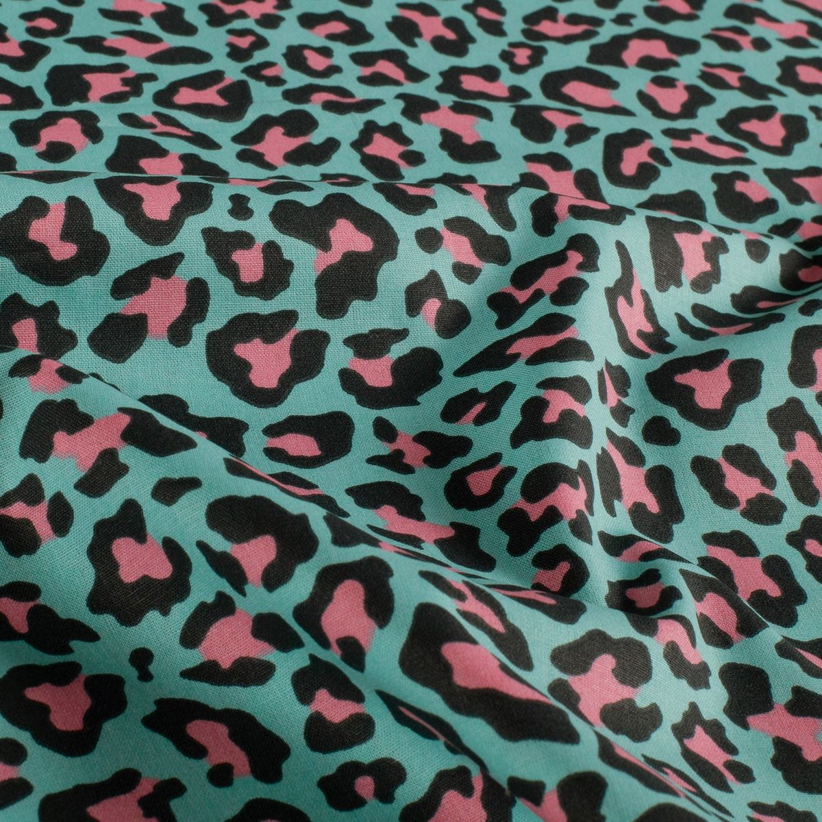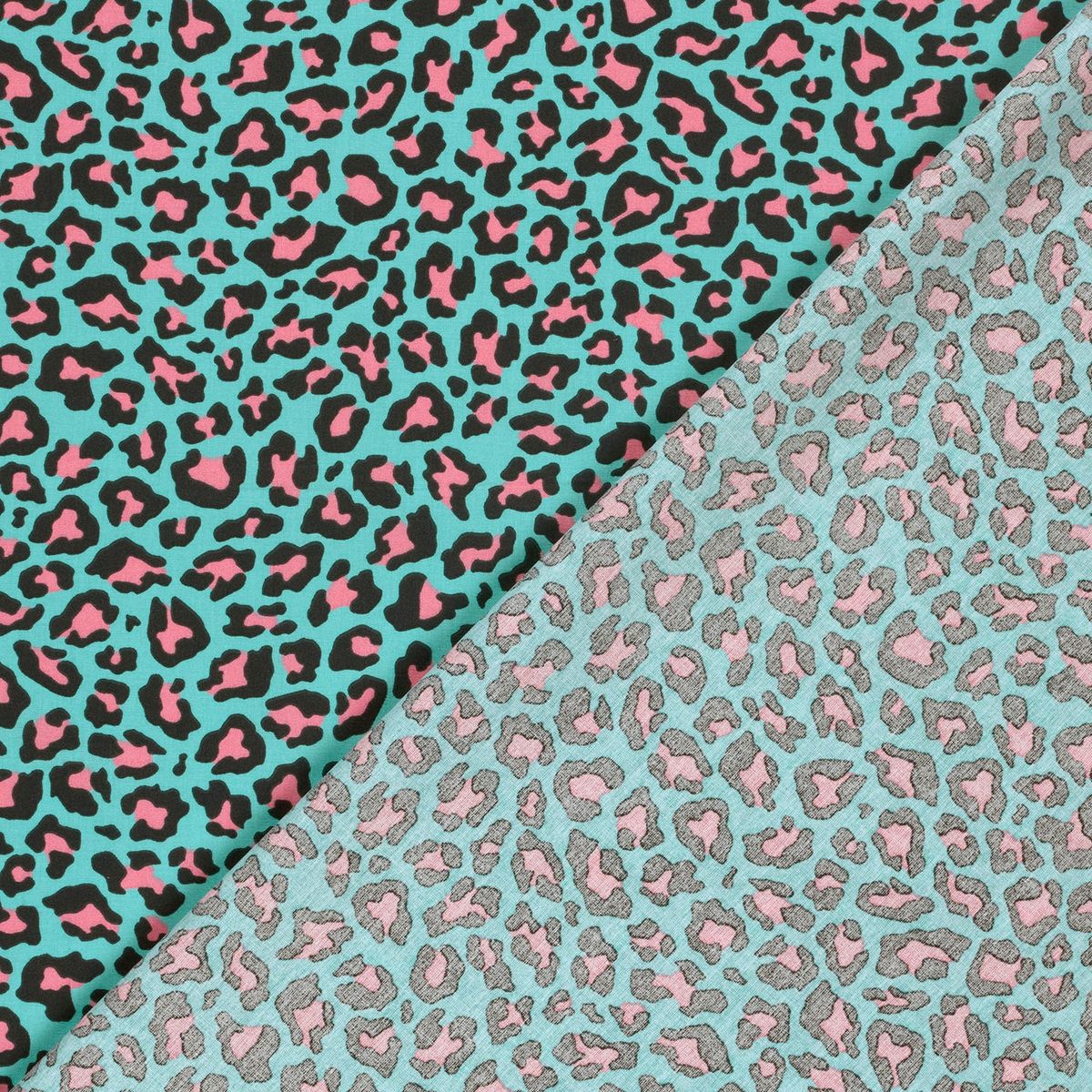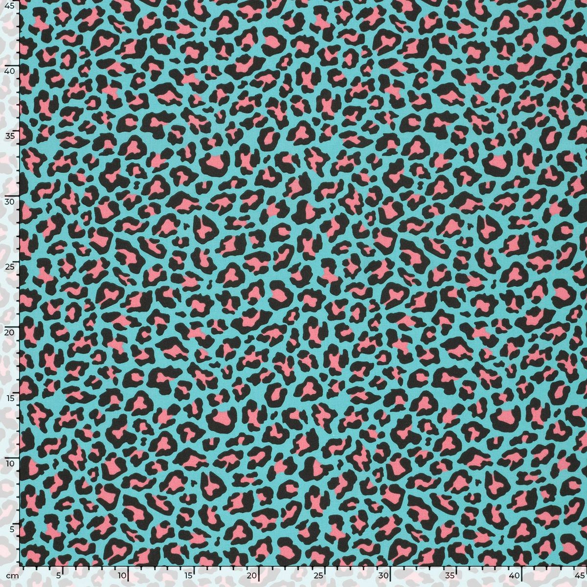 Modischer Baumwollstoff Popeline aus 100 % Baumwolle mit auffälligem Leo-Muster in Türkis, Pink und Schwarz
