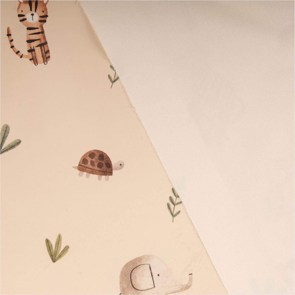Mach’s dir leicht, wenn’s draußen nass wird! Dieser Aqua-Protect-Regenjackenstoff mit süßem Safari-Tiermotiv auf beigem Hintergrund ist wasserdicht, windabweisend und angenehm soft – perfekt für alle Nähprojekte rund um Kinder und Outdoor.