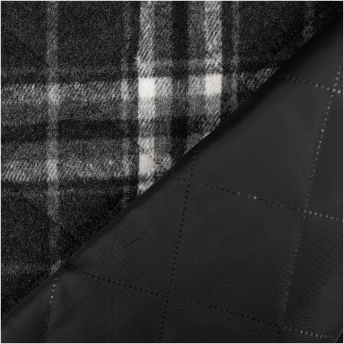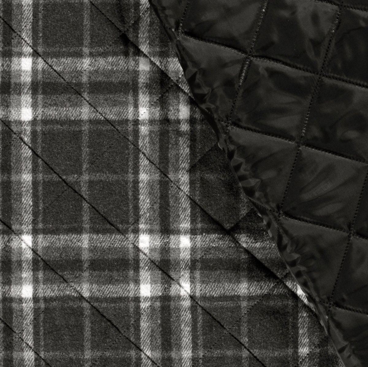 Du suchst warmen, griffigen Stoff für Outerwear? Dieser gesteppten Doubleface-Jacquard vereint eine weiche Karoseite mit einer uni schwarzen, leicht glänzenden Kunstfaser-Rückseite. Mit 380 g/m² liegt er satt in der Hand – ideal für Blazer, Jacken, Westen, Mäntel und mehr. Der Stoff ist schadstoffgeprüft.
