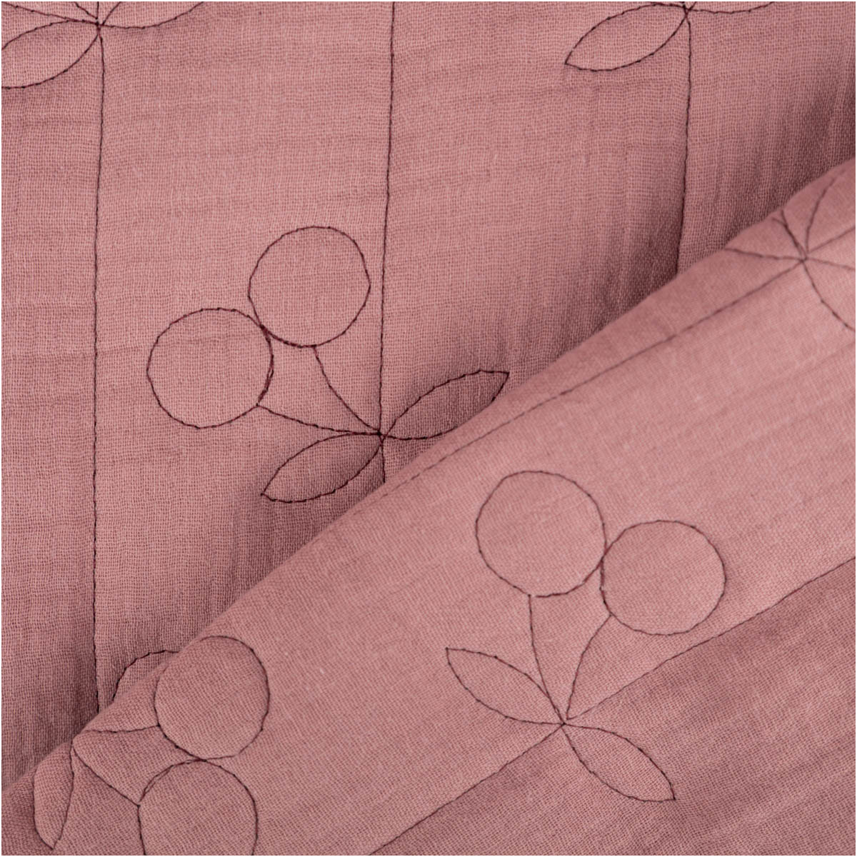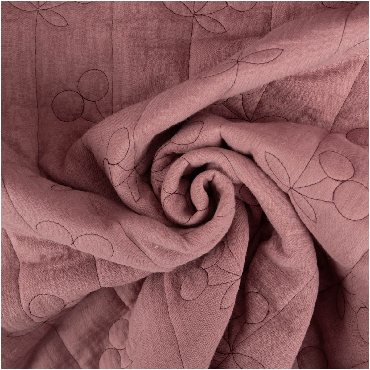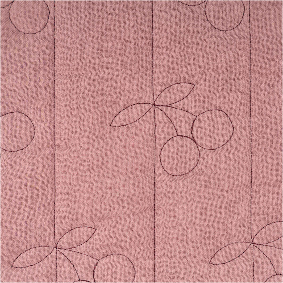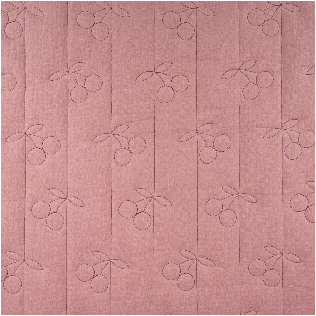Der Stoff ist dreilagig aufgebaut: oben und unten weicher Musselin, dazwischen eine wattierte Vlies-Schicht. Diese Kombination schafft eine angenehme Balance aus Leichtigkeit, Wärme und Stabilität. Die Streifensteppung hält die Lagen zusammen und setzt zusammen mit der eingestickten Kirschen-Optik einen dekorativen Akzent.