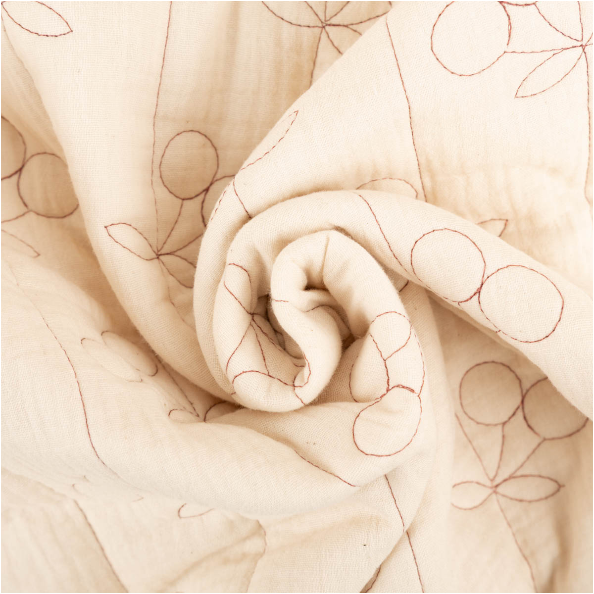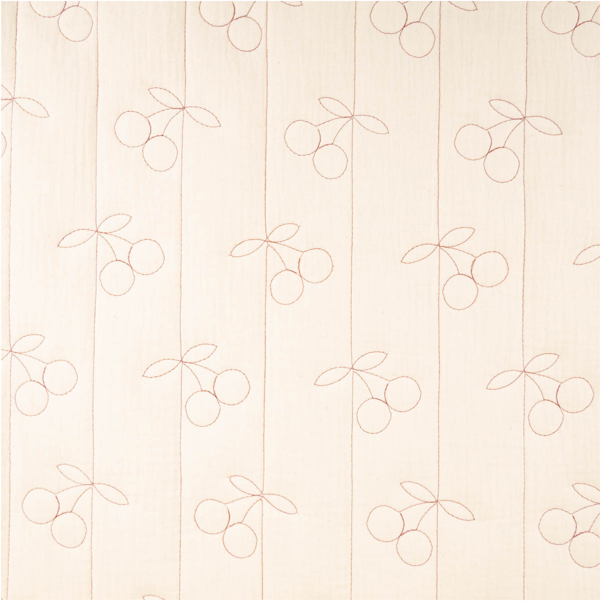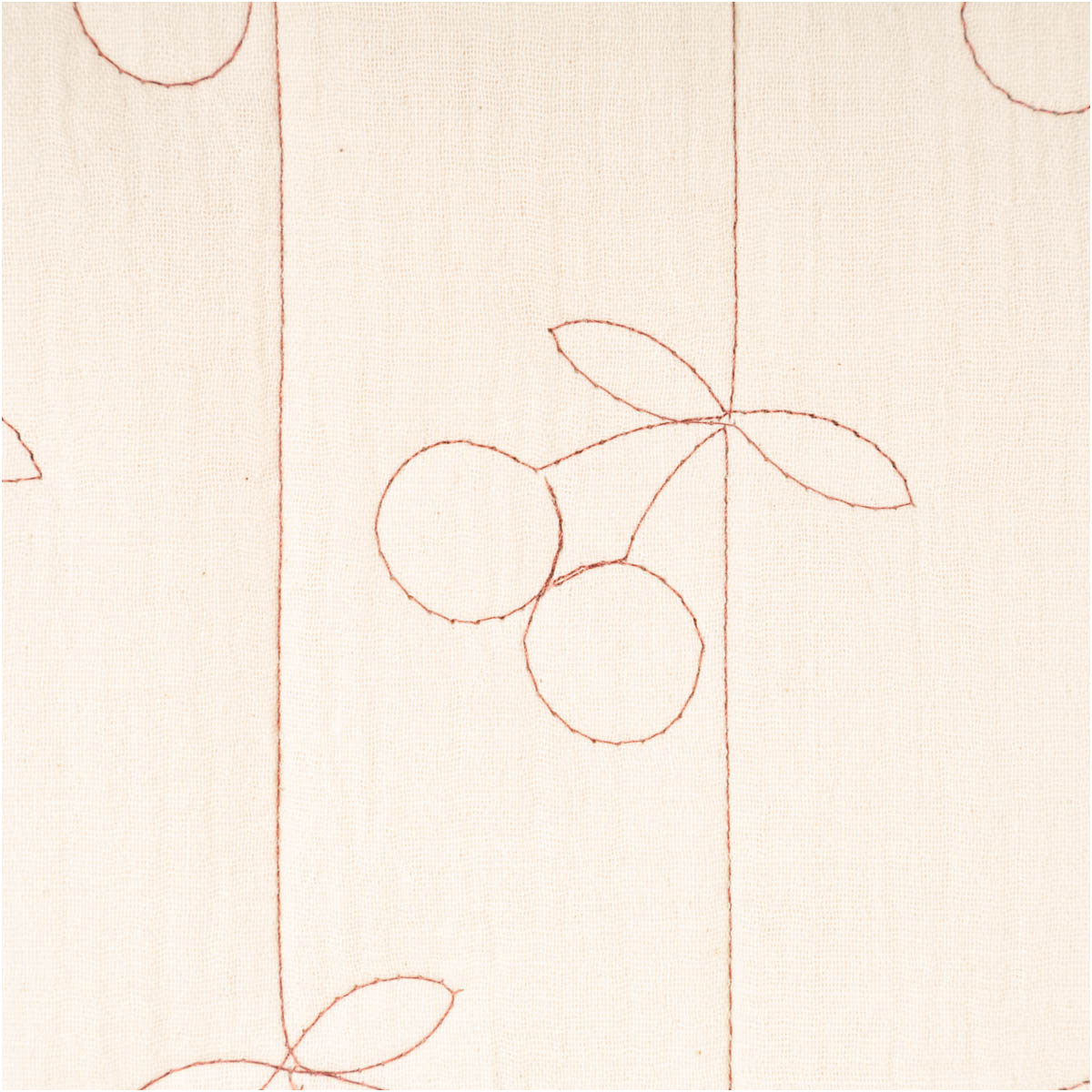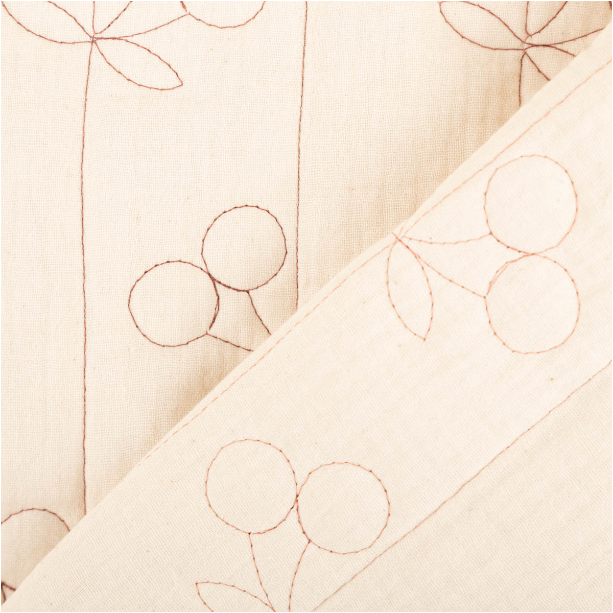 Der Stoff ist dreilagig aufgebaut: oben und unten weicher Musselin, dazwischen eine wattierte Vlies-Schicht. Diese Kombination schafft eine angenehme Balance aus Leichtigkeit, Wärme und Stabilität. Die Streifensteppung hält die Lagen zusammen und setzt zusammen mit der eingestickten Kirschen-Optik einen dekorativen Akzent.