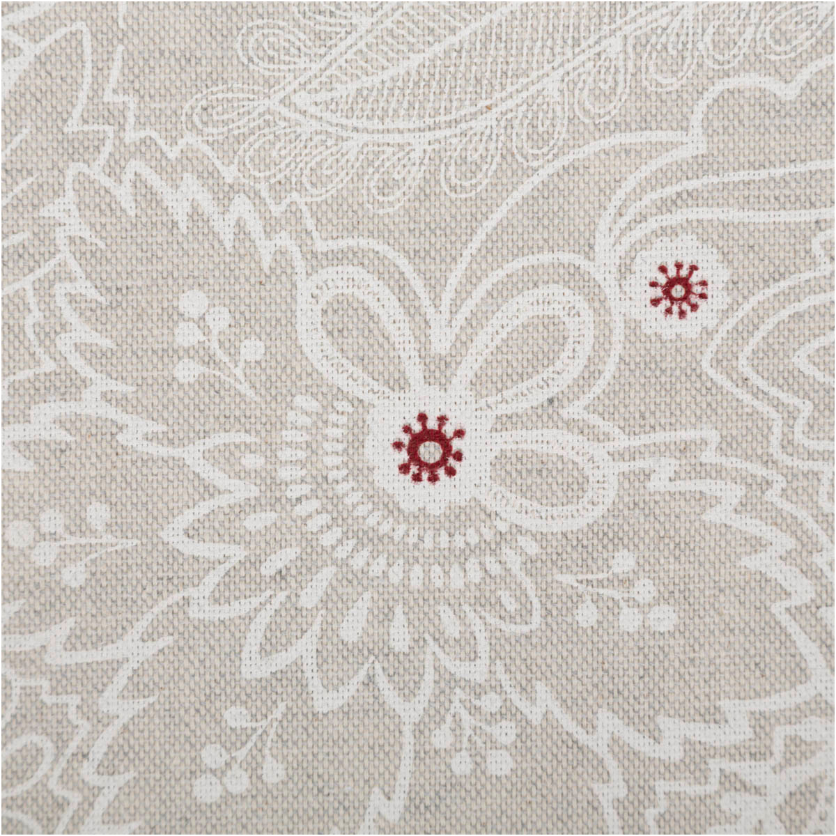 Du suchst einen vielseitigen, hochwertigen Dekostoff für dein Zuhause? Dieser robuste Baumwollstoff mit exklusivem französischem Dessin verbindet eine natürliche Optik mit langlebiger Qualität. Die rustikale Struktur in Natur wird durch weiße Ornamente und kleine rote Akzente perfekt ergänzt – ideal für einen zeitlosen Landhausstil oder als dezente Weihnachtsdeko.