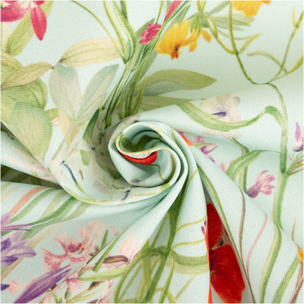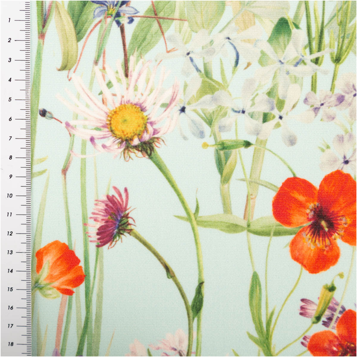 Der besondere Reiz dieses Stoffes liegt in seinem aufwendig gestalteten Digitaldruck mit Wiesenblumen. Das Motiv wirkt leicht, sommerlich und detailverliebt. Die einzelnen Blüten kommen auf dem hellen Hintergrund besonders gut zur Geltung und verleihen dem Stoff eine luftige, freundliche Optik. Dadurch passt das Design ideal zu natürlichen, romantischen, verspielten oder modernen Outdoor-Konzepten.