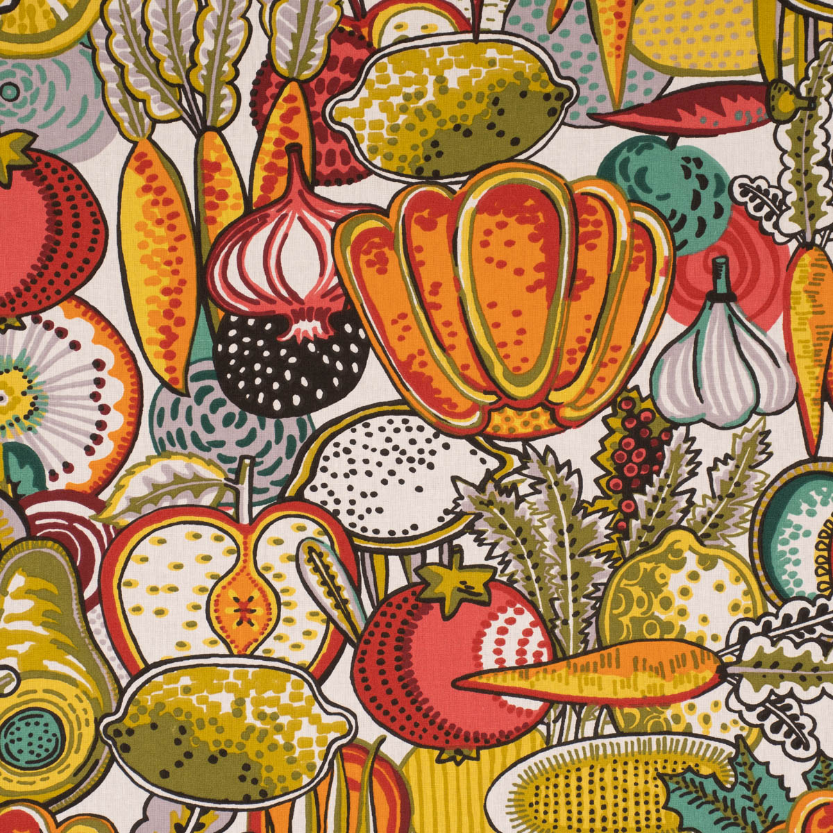 Dekostoff aus reiner Baumwolle mit abstraktem Obst und Gemüse - Print und einer komfortablen Extra-Breite von 160cm - exklusives Dessin aus Frankreich.