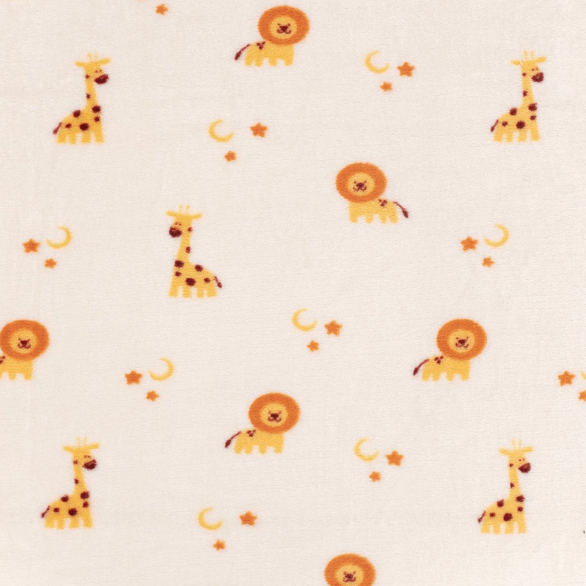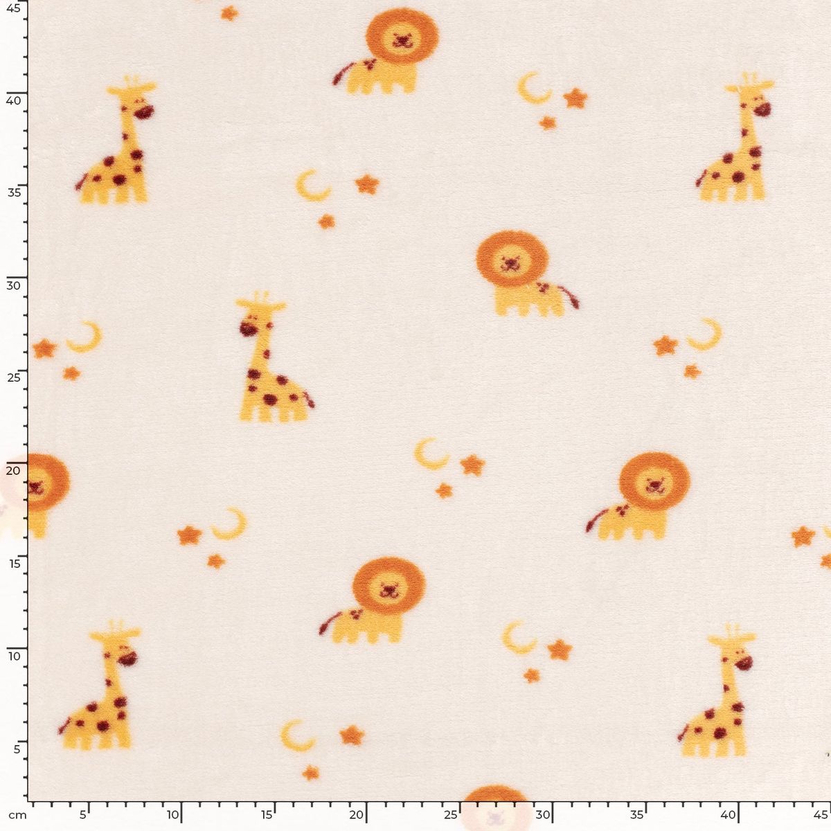 Kuschelweicher Fleece mit niedlichem Safari-Dessin aus Giraffen, Löwen, Monden und Sternen. Beidseitig flauschig, wärmend und dabei leicht – perfekt für Baby- und Kinderbekleidung sowie gemütliche Decken und Kissen.