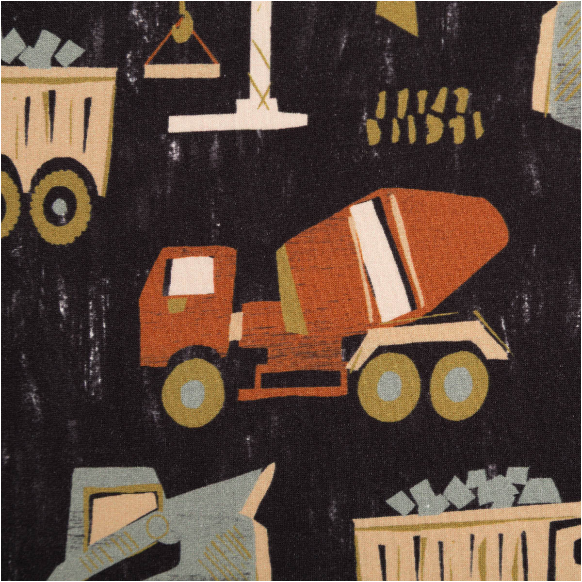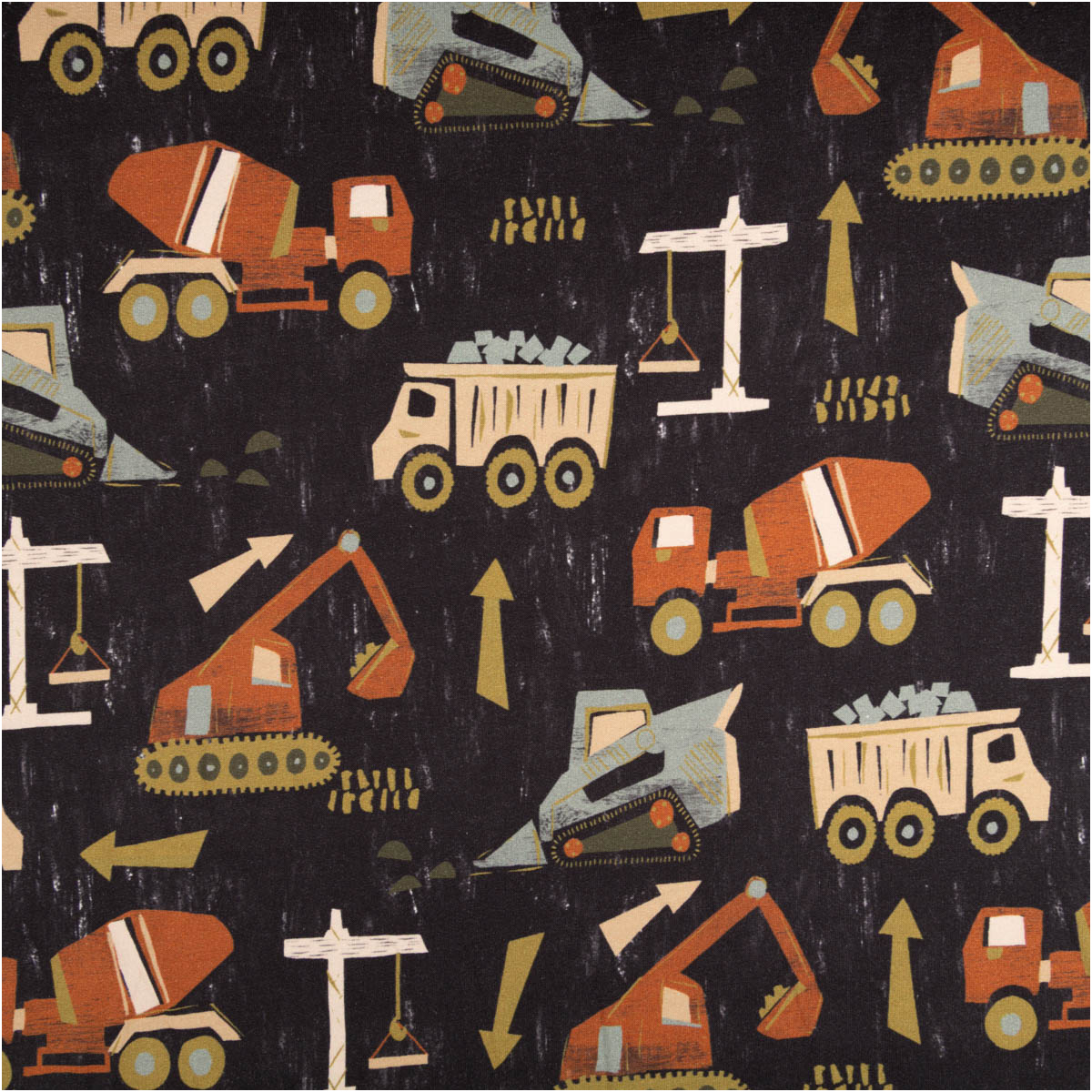 Kindgerechtes Baustellenmotiv mit Baggern, Kränen, Kippern und Lastwagen in Braun und Grün auf marineblauem Hintergrund