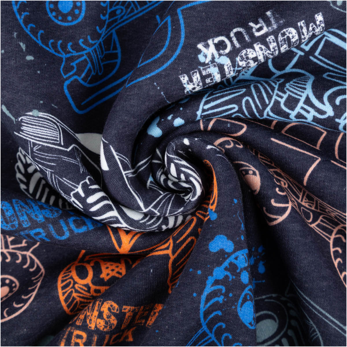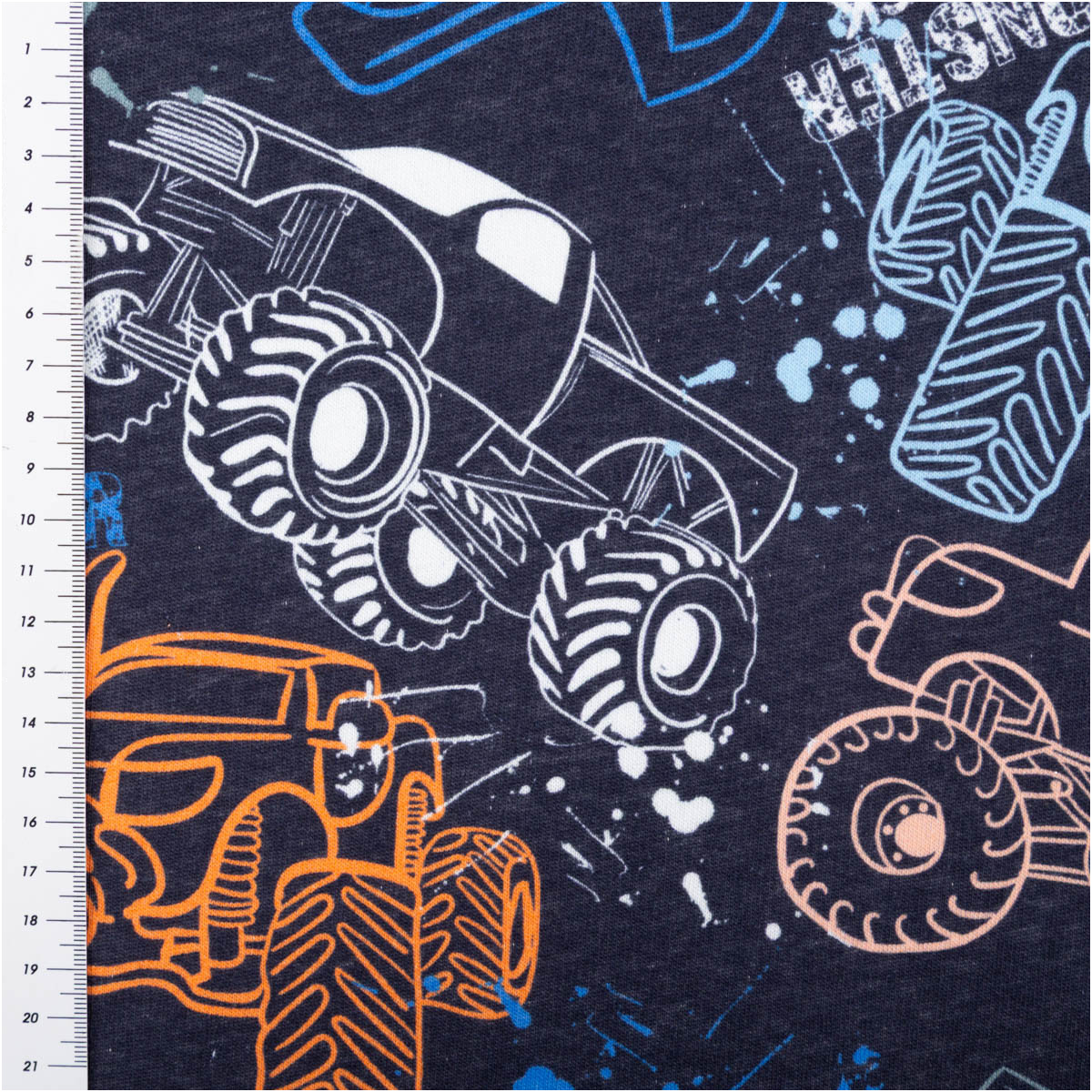 Sweatstoff Baumwolle Monstertrucks Digitaldruck dunkelblau 155cm breit