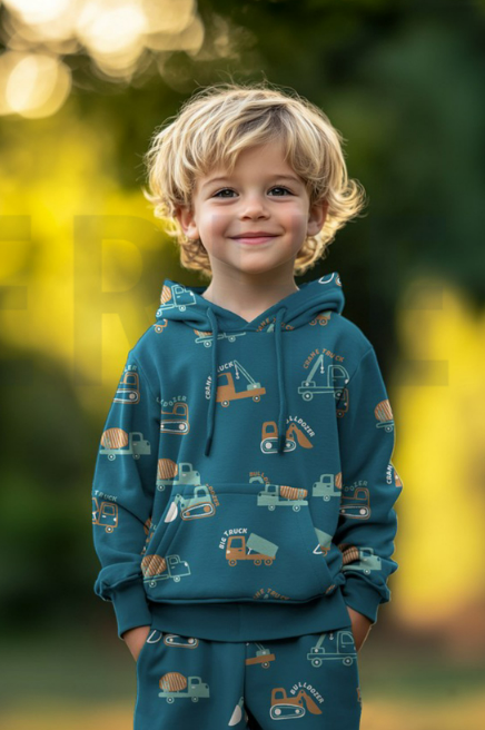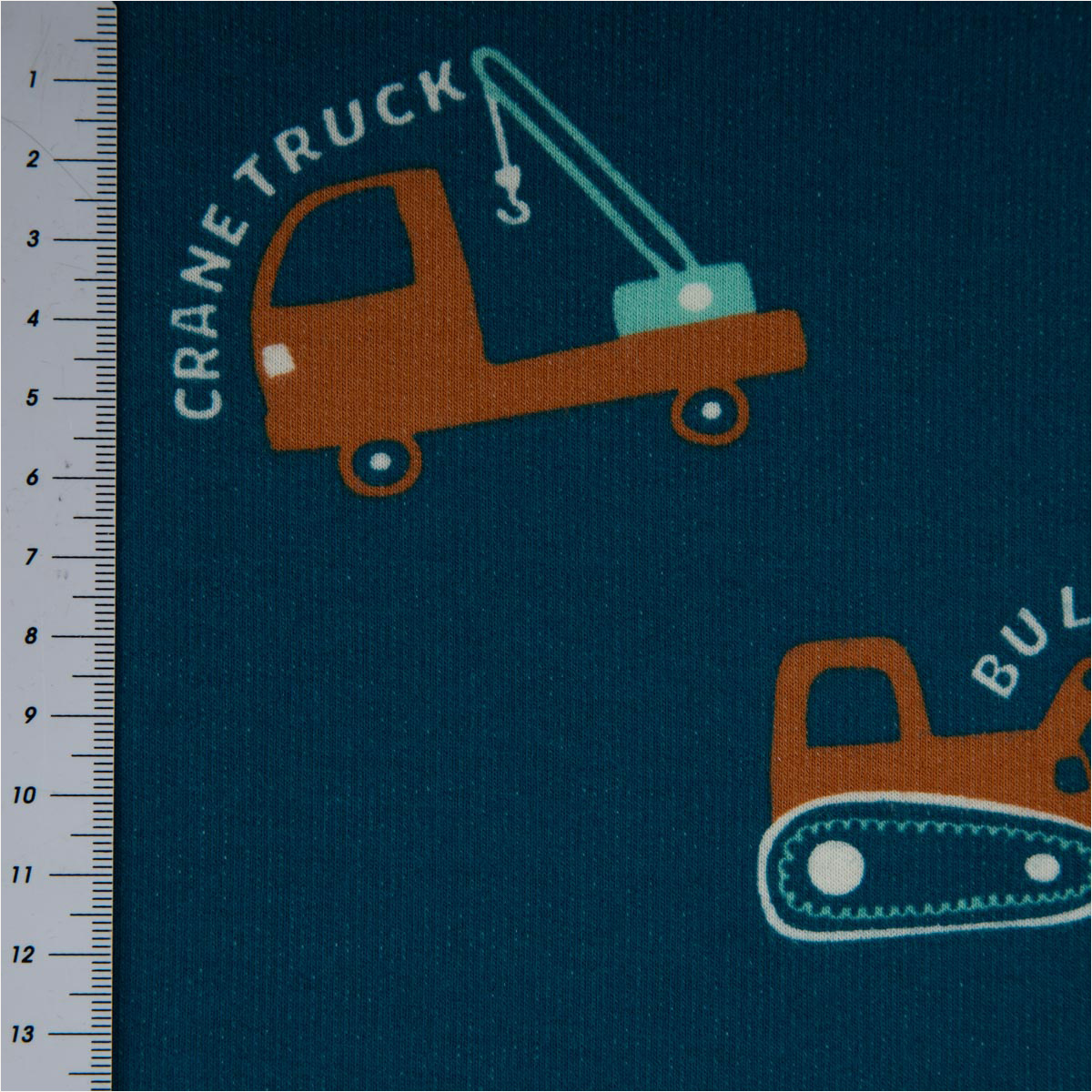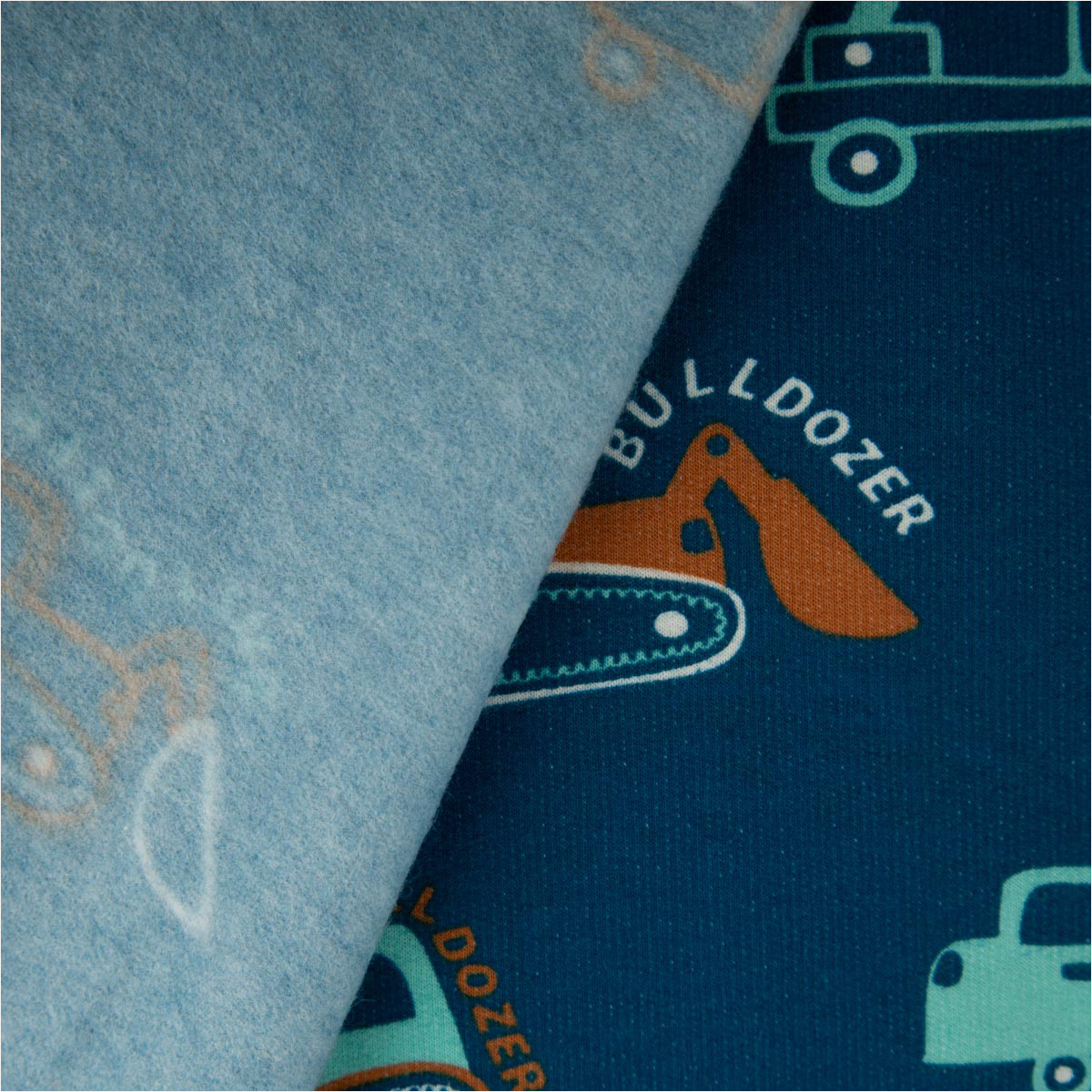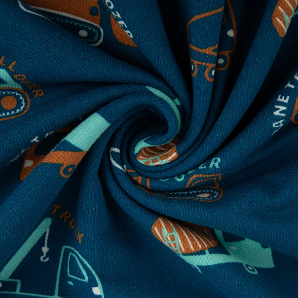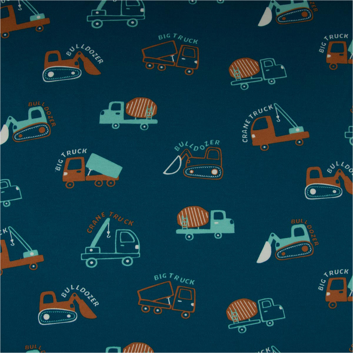 Weicher Soft Sweat Stoff Petrol mit Baufahrzeugen in Blau und Orange