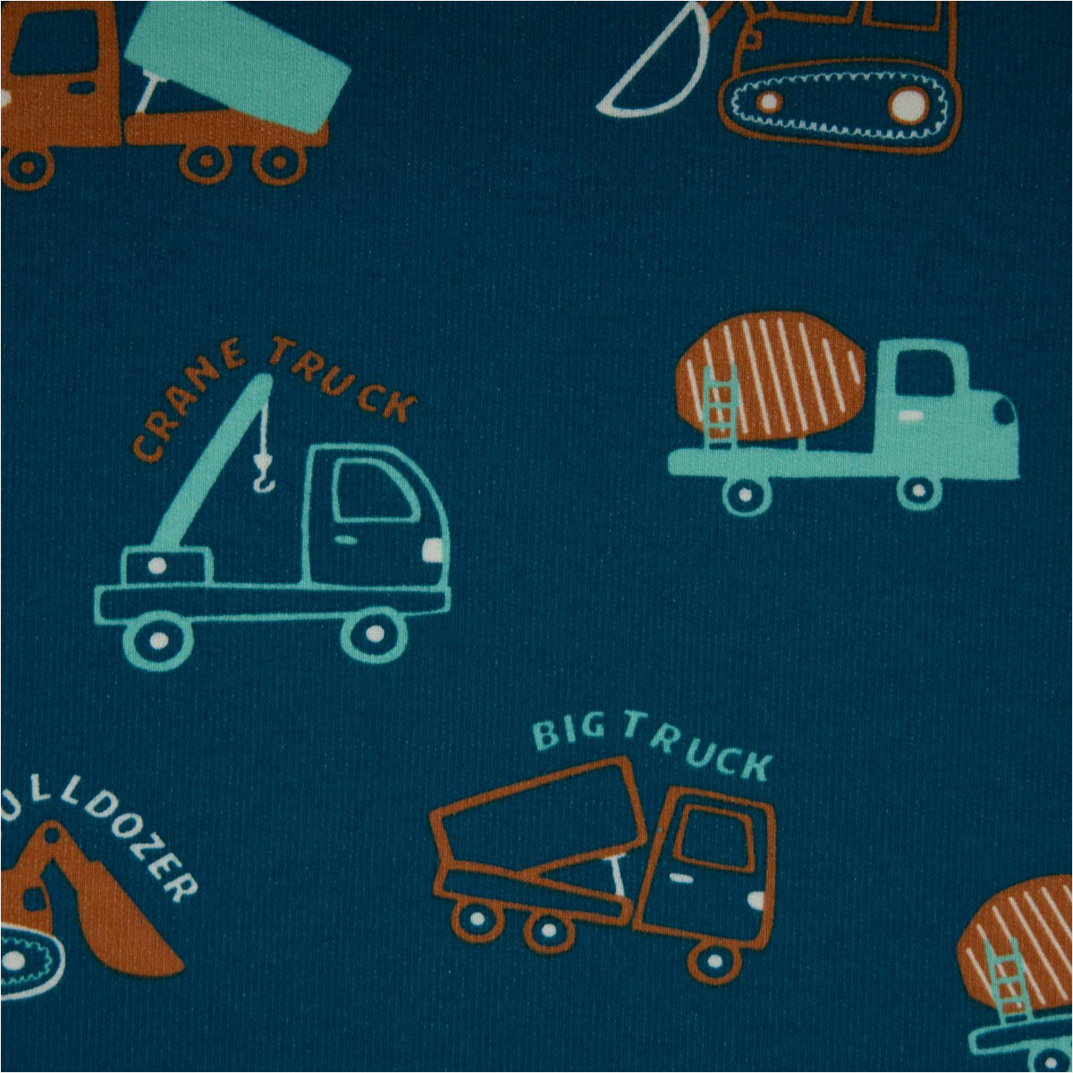 Sweatstoff Soft Sweat Baumwolle Baufahrzeuge petrol orange – 1,48 m breit