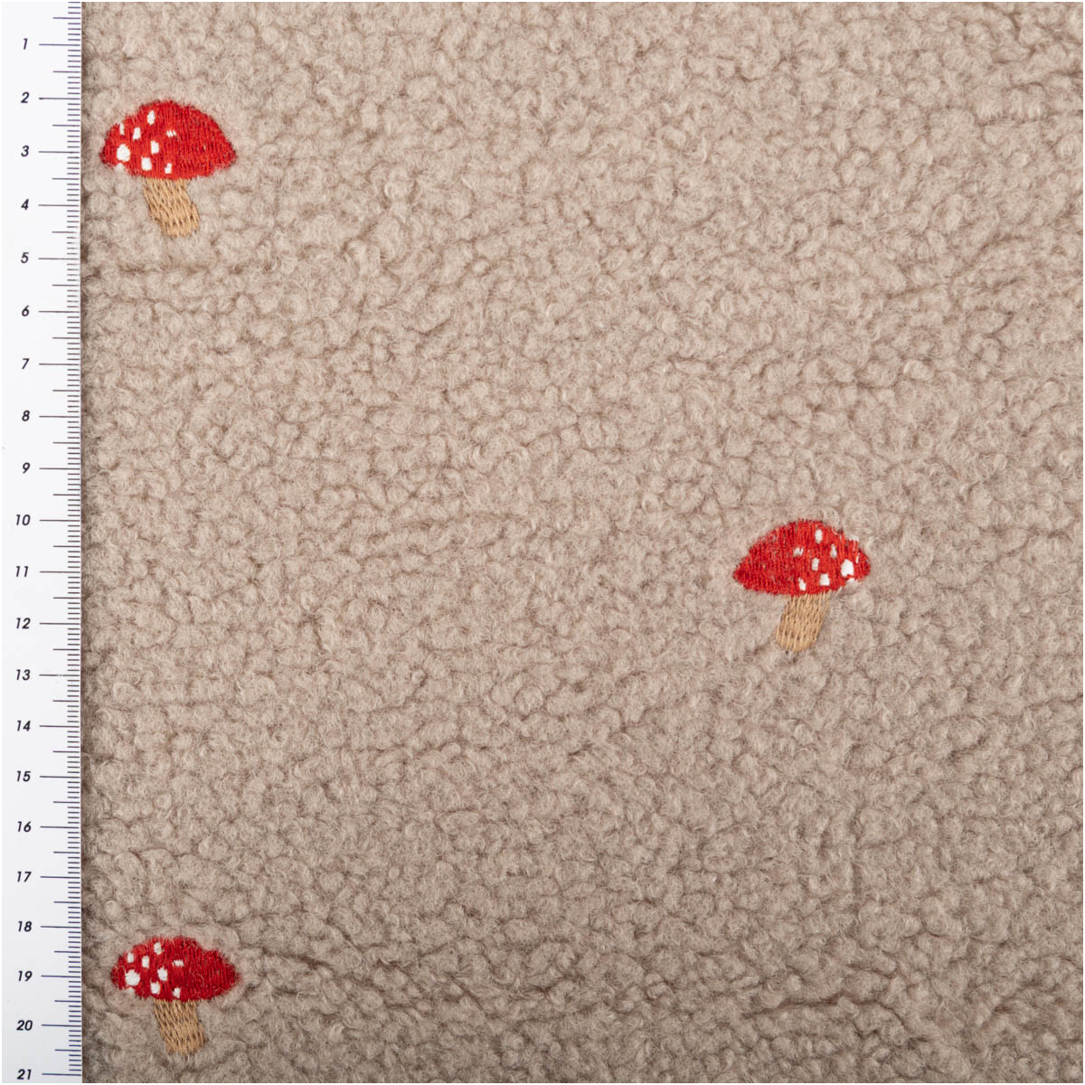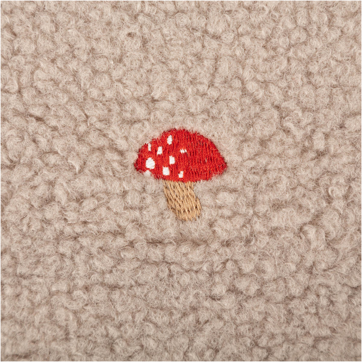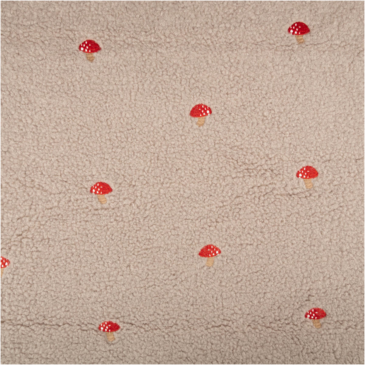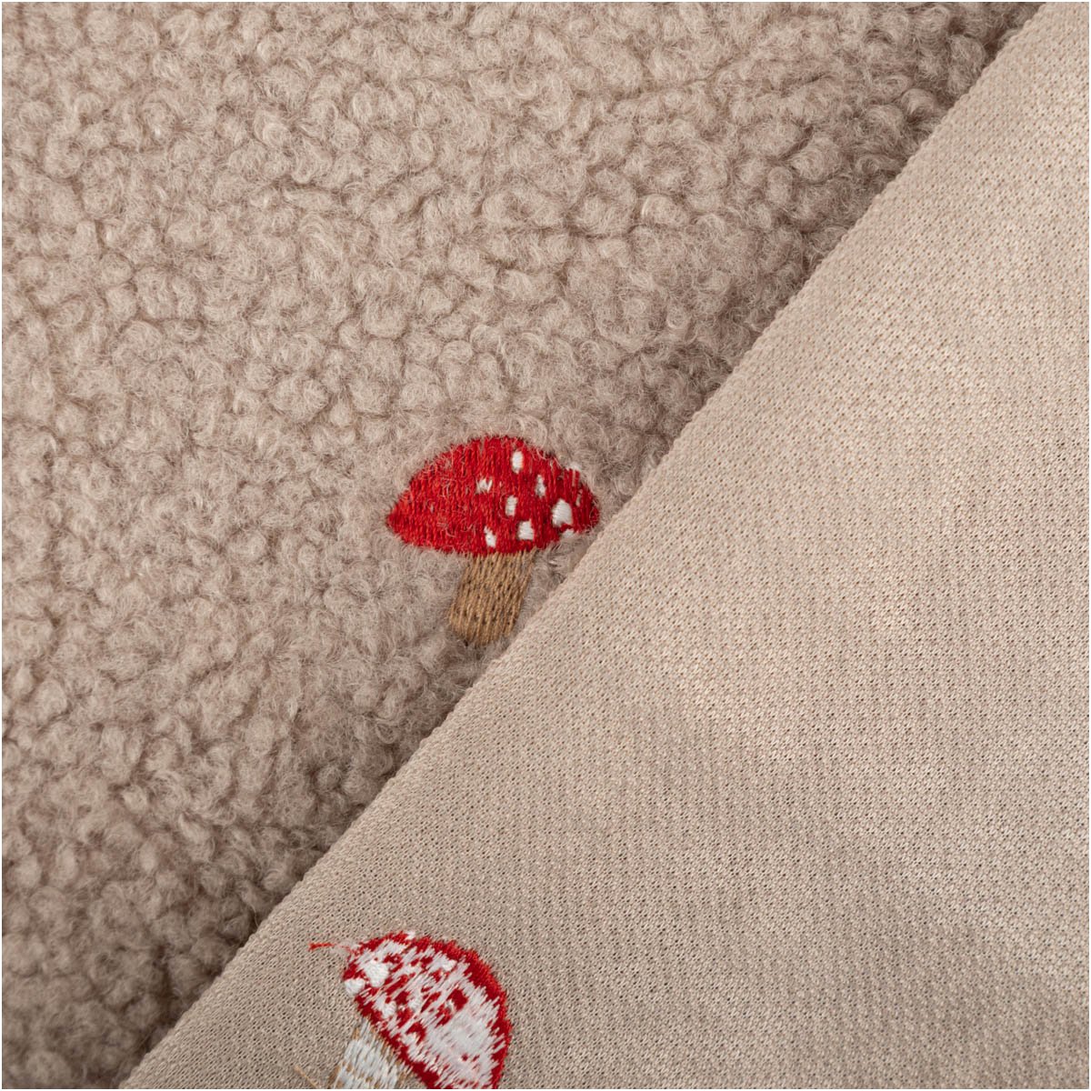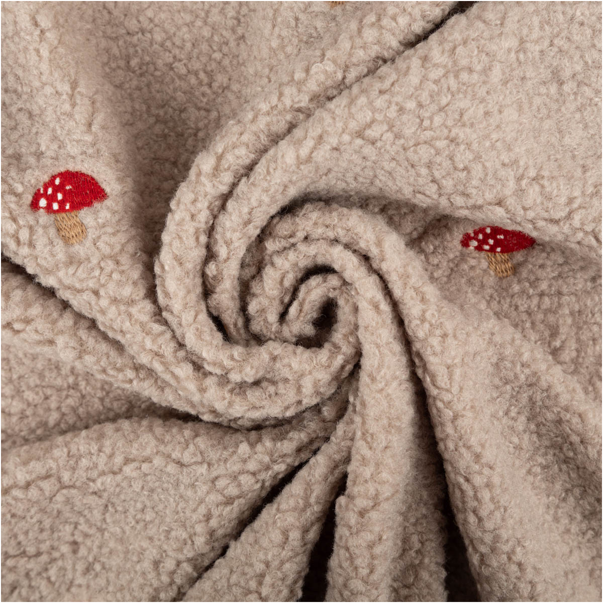 Teddystoff Boucle Pilze Stickerei beige rot 160cm Breite