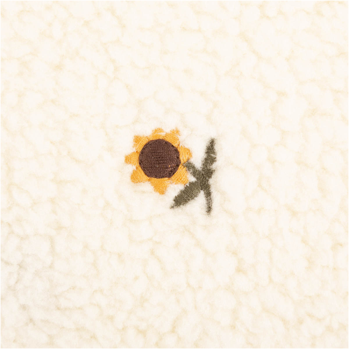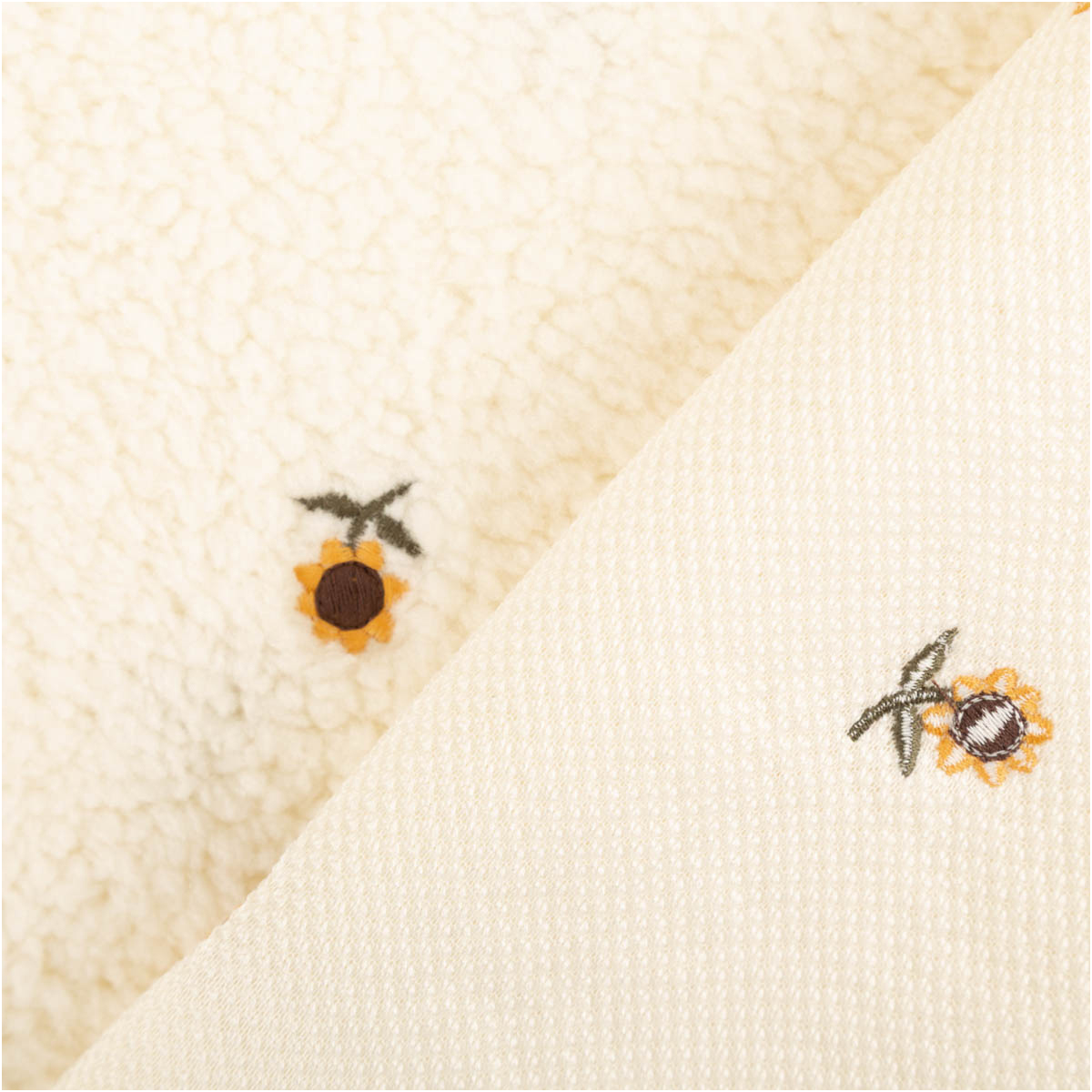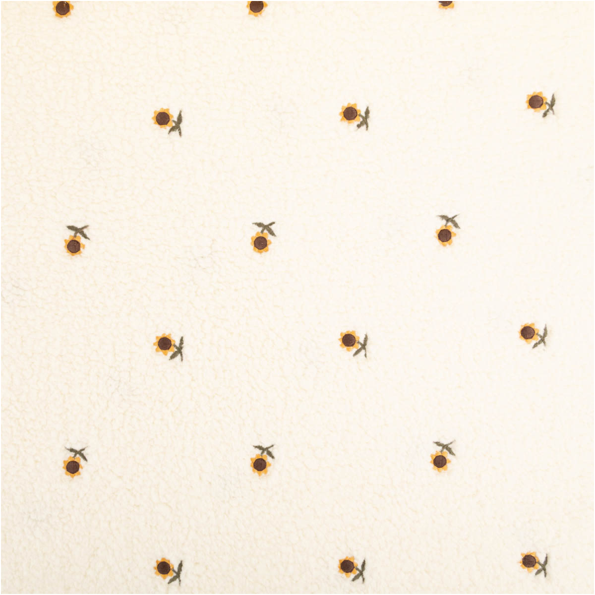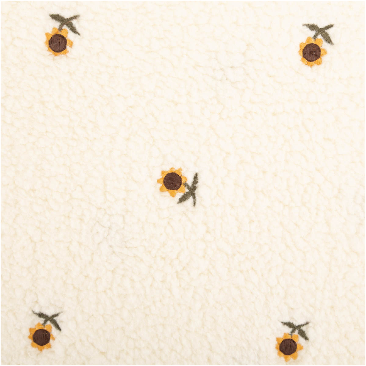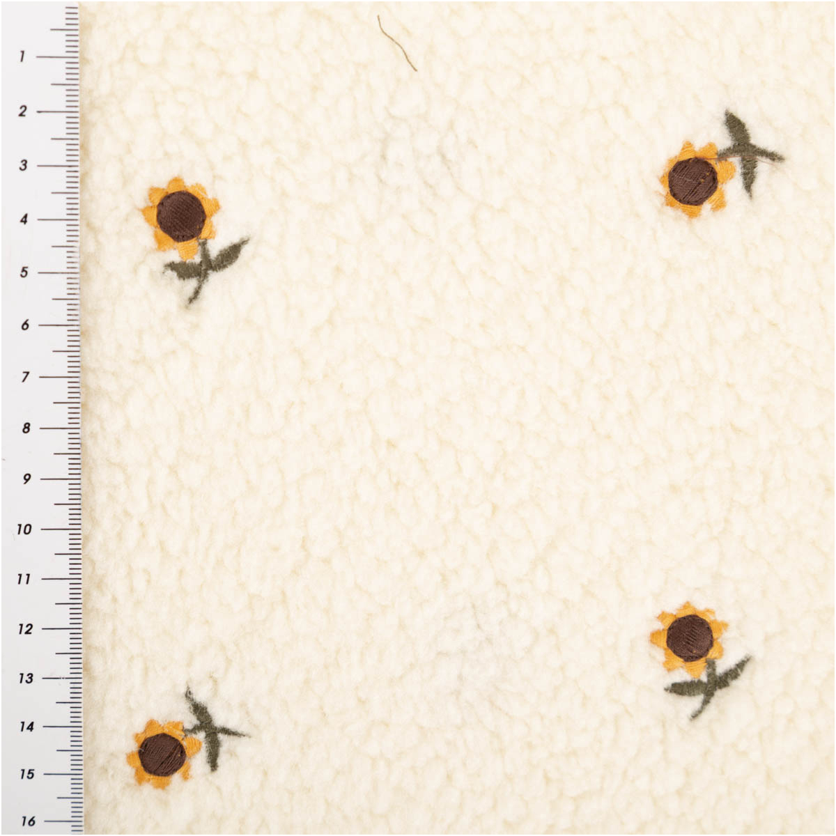 Flauschiger Teddystoff Bouclé mit weicher, voluminöser Oberfläche und liebevoller Sonnenblumen-Stickerei in ecru und gelb für gemütliche Nähprojekte