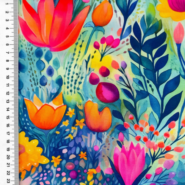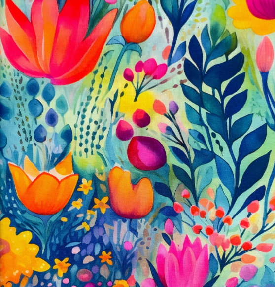 Das lebendige Muster kombiniert florale Elemente mit dekorativen Blättern in kräftigen Farben wie Rot, Orange, Grün, Blau und Gelb. Die dynamische Gestaltung wirkt modern, kreativ und ausdrucksstark. Durch den hochwertigen Digitaldruck erscheinen die Farben besonders intensiv und die Details klar und präzise.