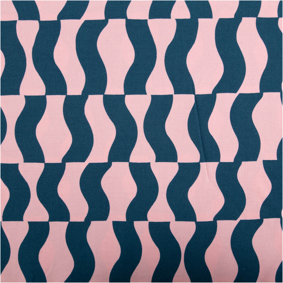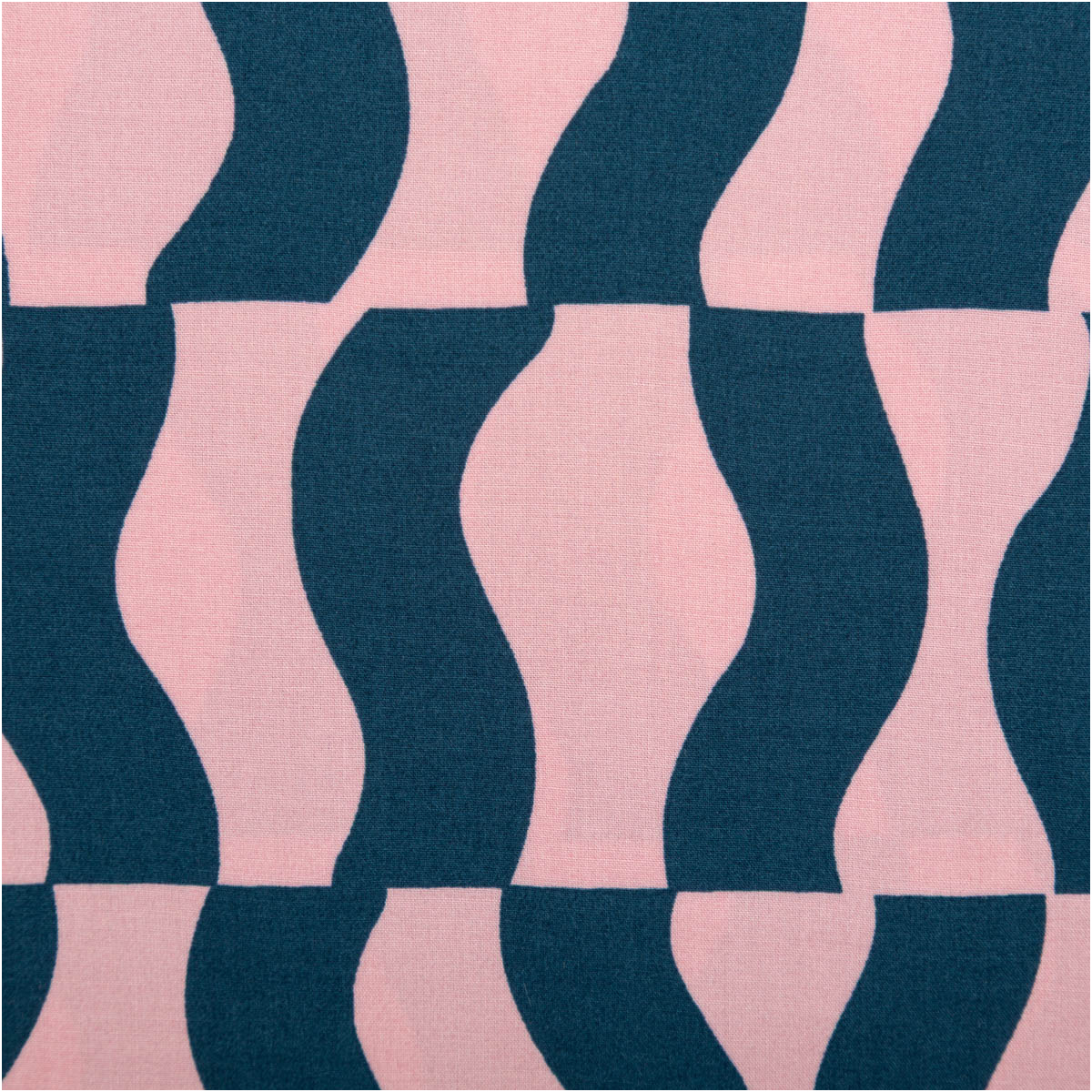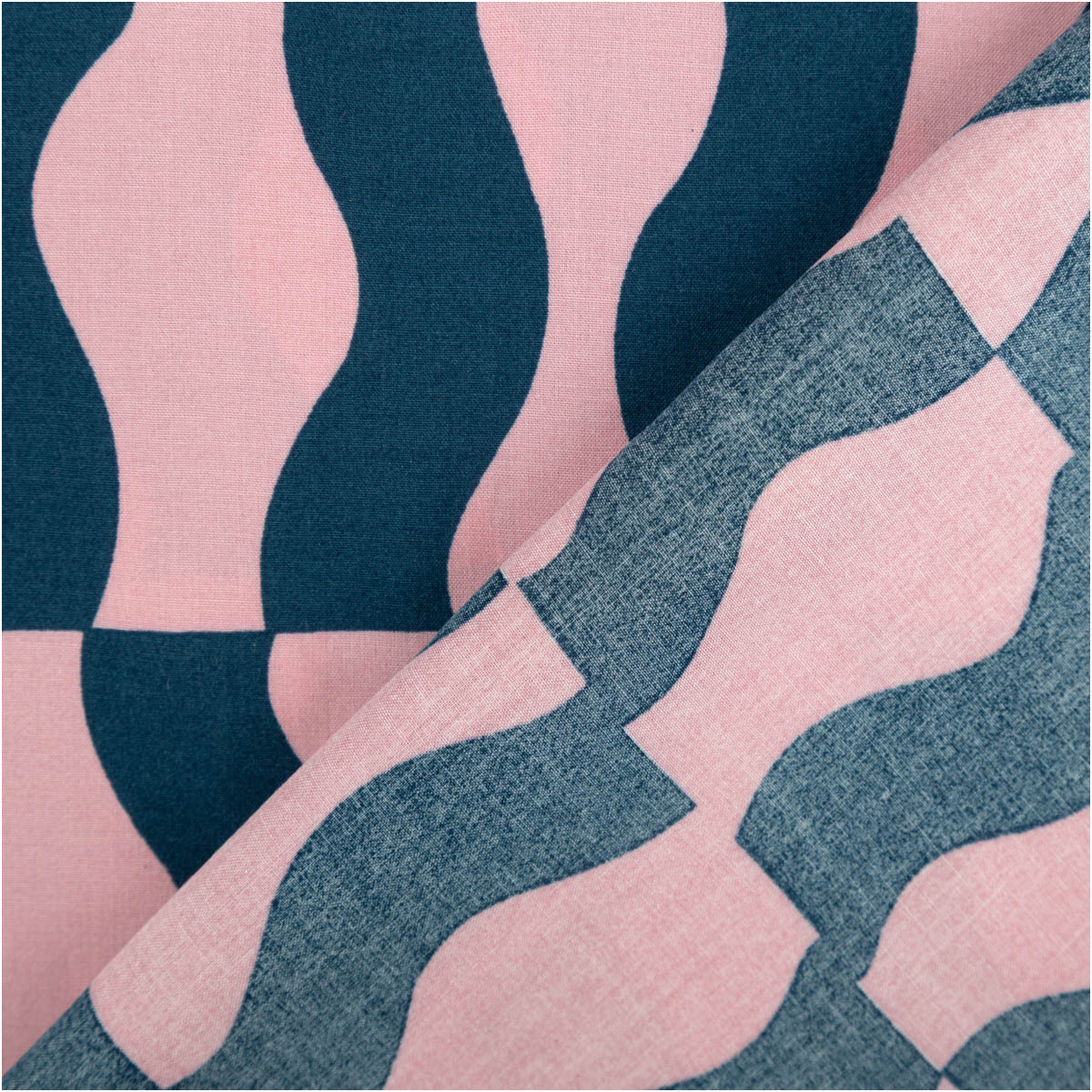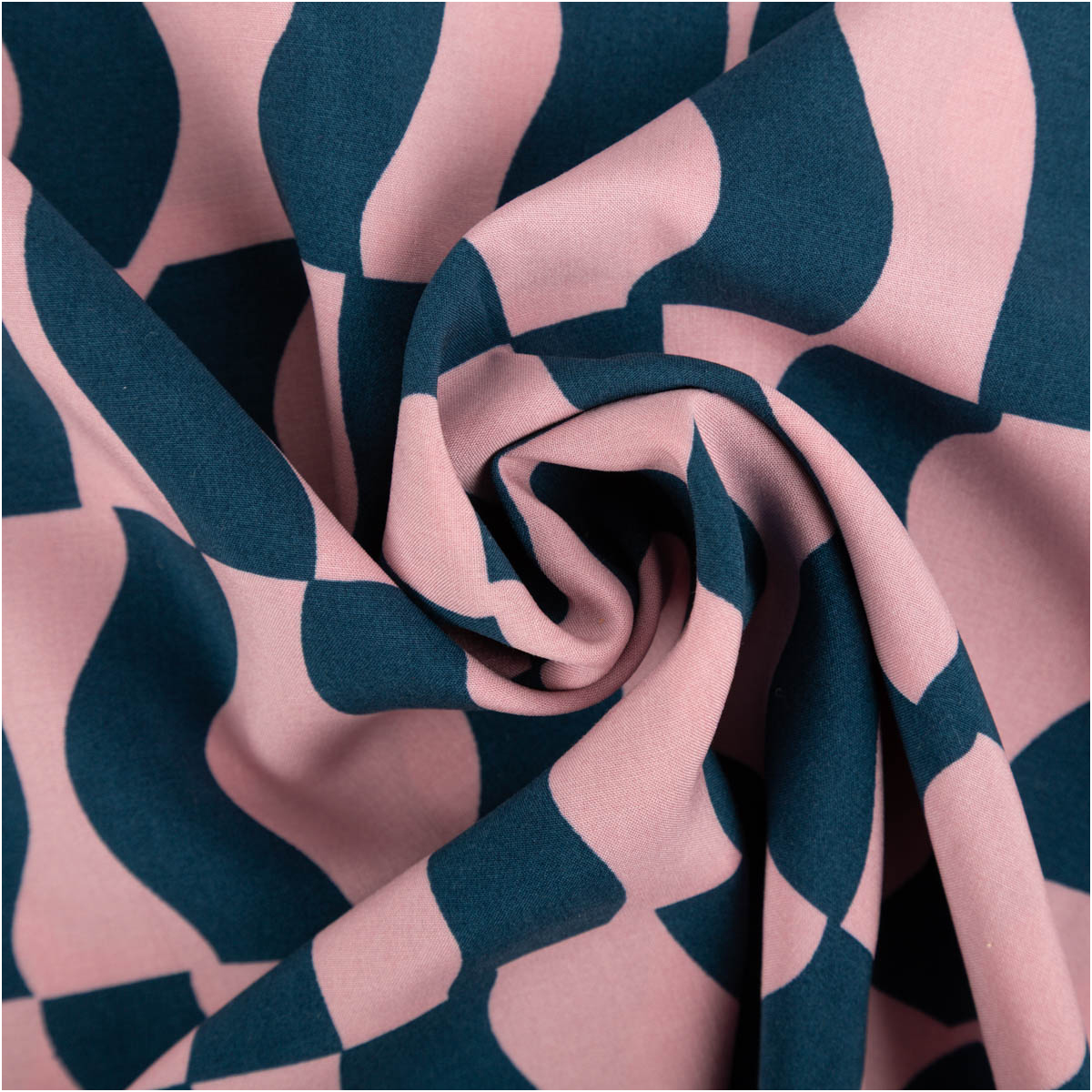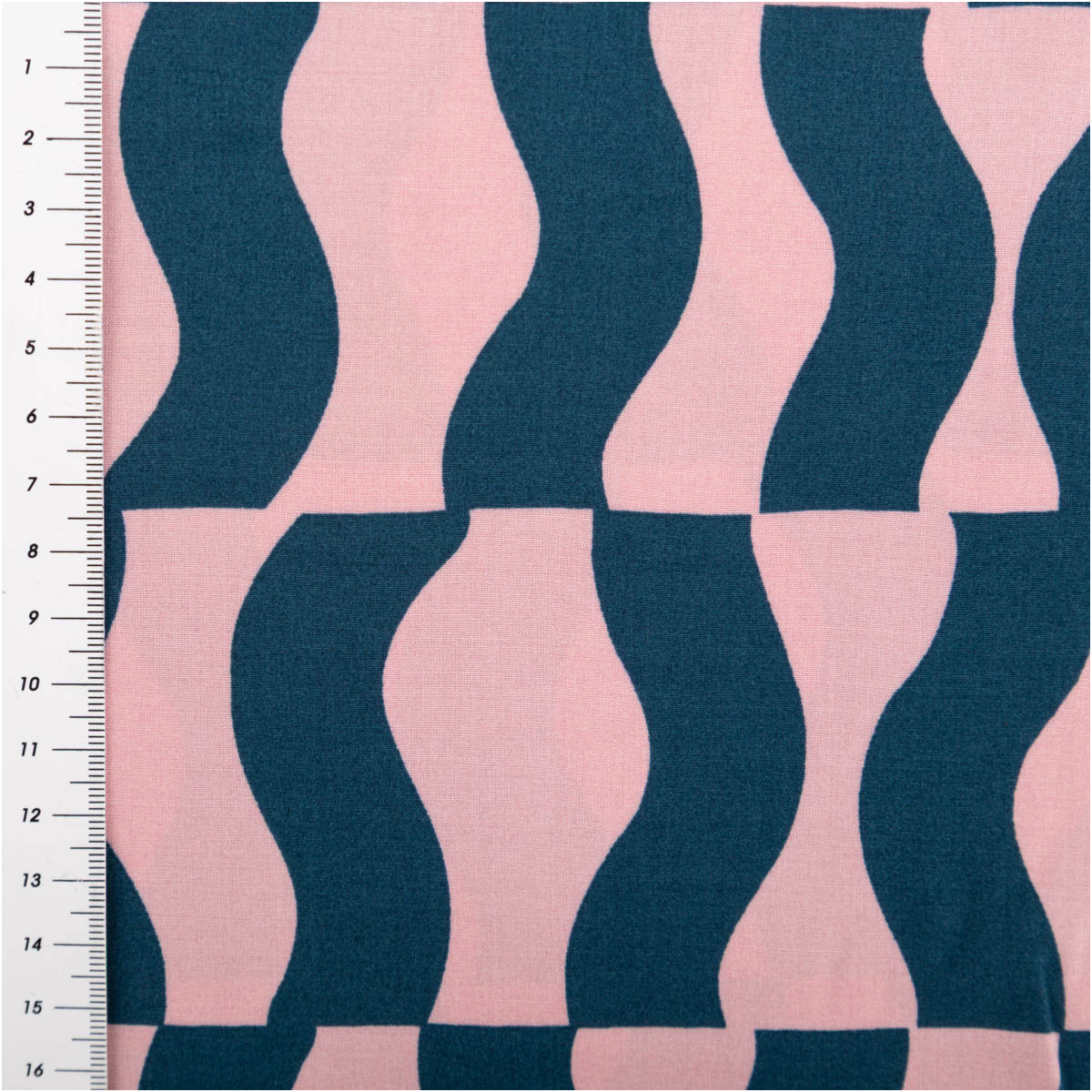 Dieser Viskose Stoff aus Lenzing EcoVero™ überzeugt mit einem modernen Wellenmuster in Rosa und Dunkelblau. Das grafische Design wirkt lebendig, zeitgemäß und sorgt für einen spannenden Look mit Wiedererkennungswert. Die Kombination aus weichen Rosatönen und tiefem Dunkelblau bringt Kontrast und Harmonie zugleich in deine Nähprojekte.
