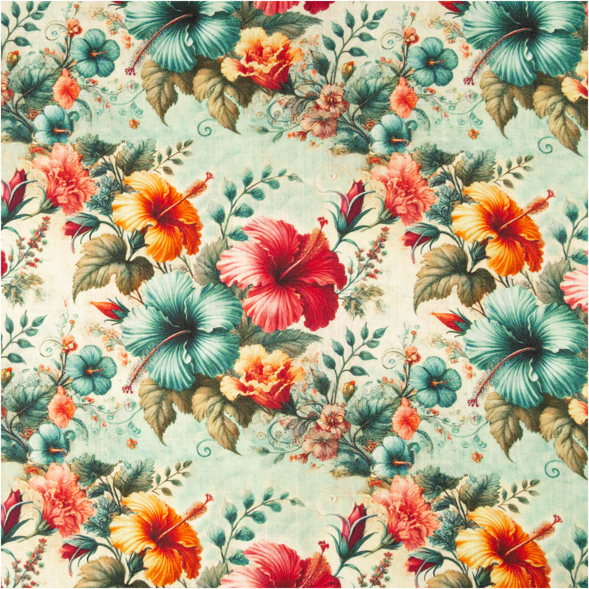 Hibiskusblüten -Digitaldruck: kräftige Farben in pink, türkis und orange auf naturfarbenem Grund, detailreich und modern