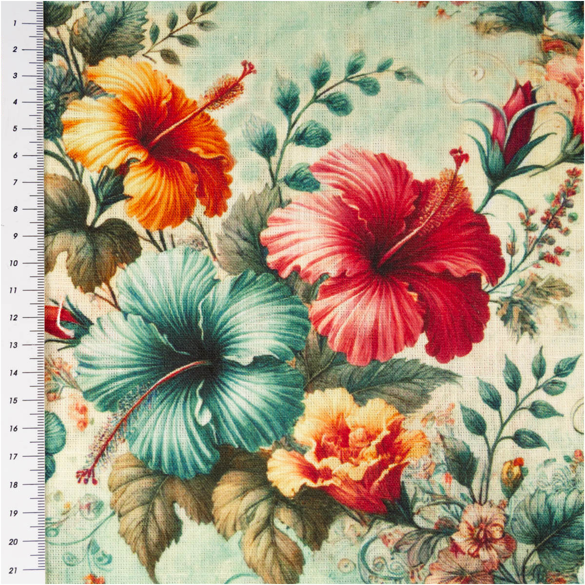 Viskose-Leinen Stoff mit Hibiskusblüten – pink/türkis/orange (Digitaldruck, 1,43 m breit)