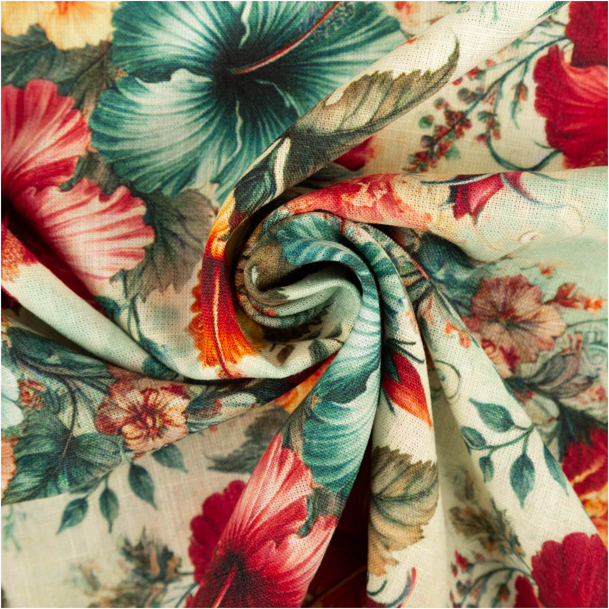 Viskose Stoff mit 42% Leinenanteil Hibiskusblüten pink, türkis, orange 1,43cm Breite