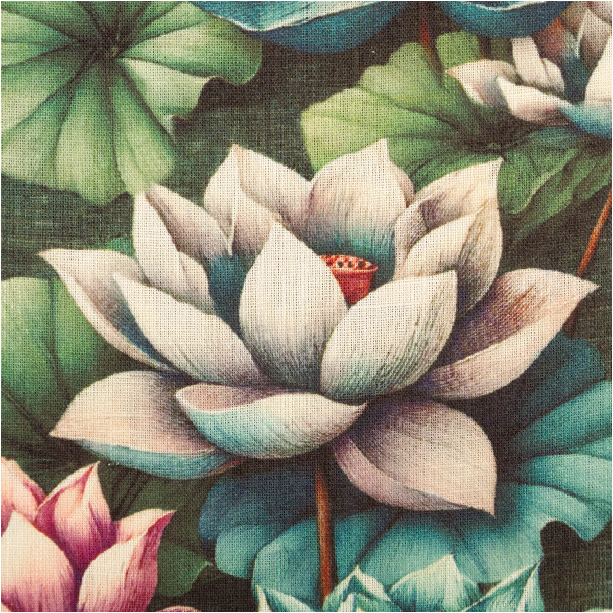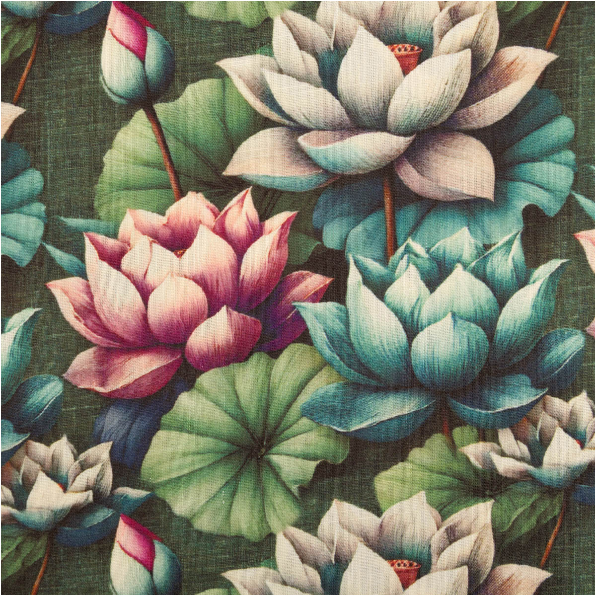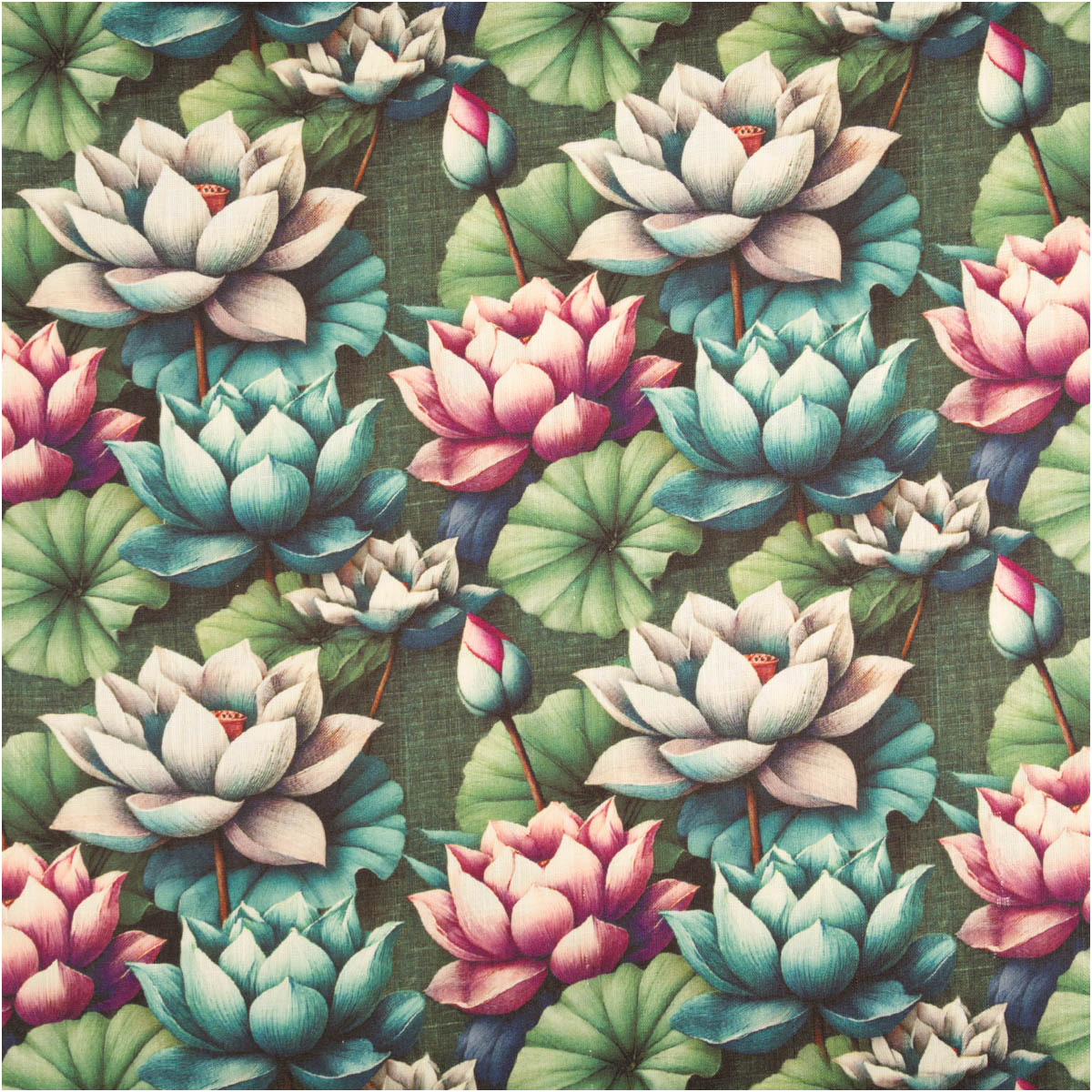 Wasserrosen-Digitaldruck: detailreiches Motiv in grün, pink und türkis, wirkt wie gemalt und setzt moderne Akzente