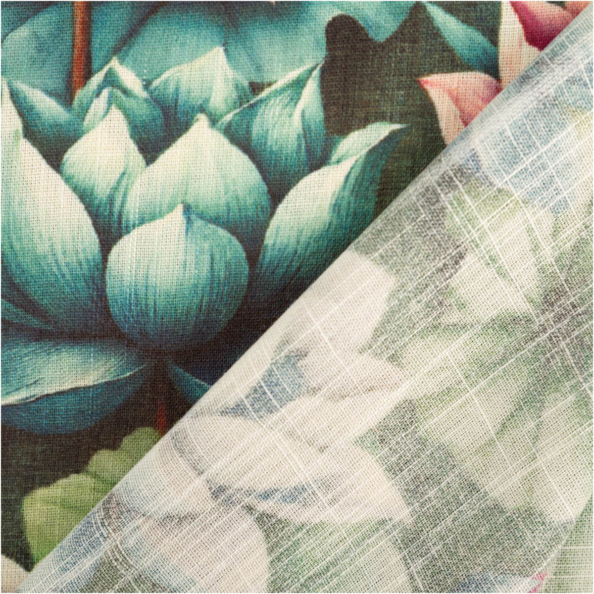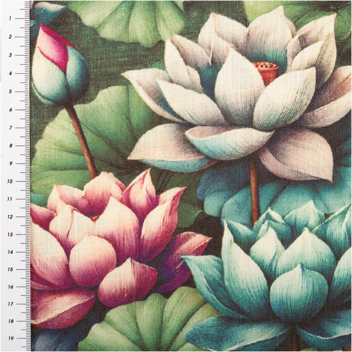 Viskose-Leinen Stoff mit Wasserrosen – grün/pink/türkis (Digitaldruck, 1,43 m breit)