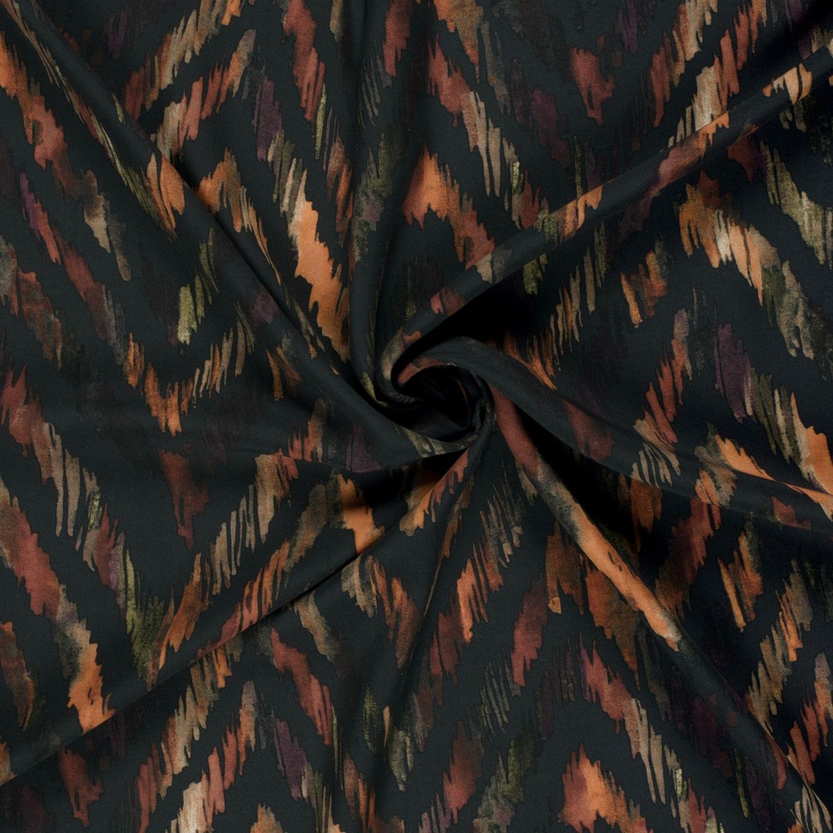 Leichte, glatte Viskose-Popeline mit abstraktem Zickzack-Dessin in warmen Naturtönen auf Dunkelgrau. Mit 145 cm Breite und ca. 110 g/m² ist er perfekt für luftige Sommer-Looks – kühl auf der Haut, weich fallend und angenehm zu tragen.