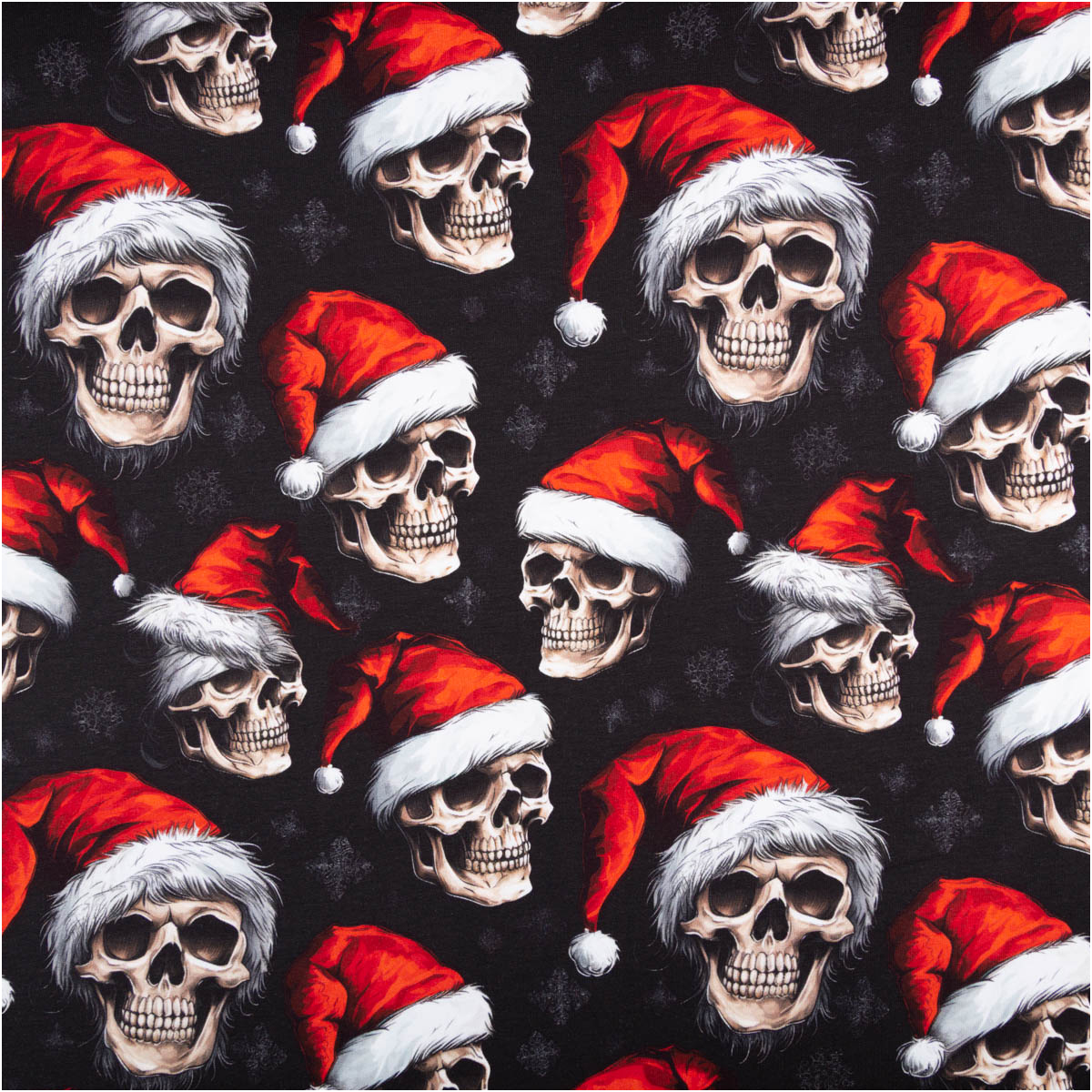 Dieser French Terry Stoff ist ein echter Hingucker für alle, die Weihnachten mal anders interpretieren möchten. Das außergewöhnliche Motiv zeigt detailreiche Totenköpfe mit Weihnachtsmützen in kräftigem Rot auf schwarzem Grund – perfekt für alle, die einen coolen, alternativen Look lieben.