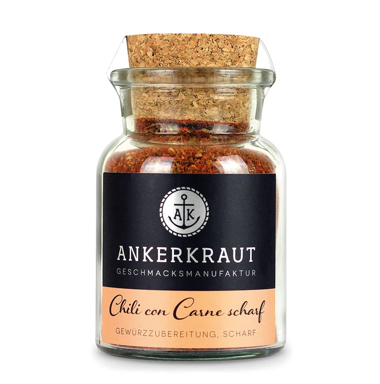 Chili con Carne scharf – Gewürzmischung im Glas 80 g mit Korkdeckel (Ankerkraut)