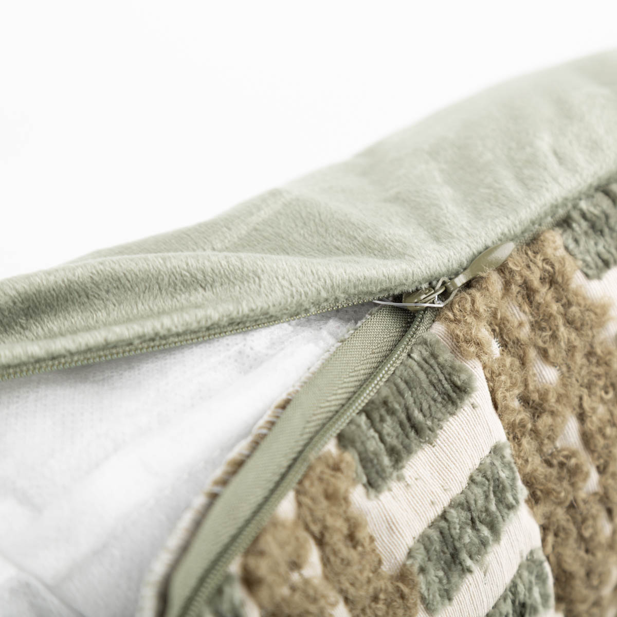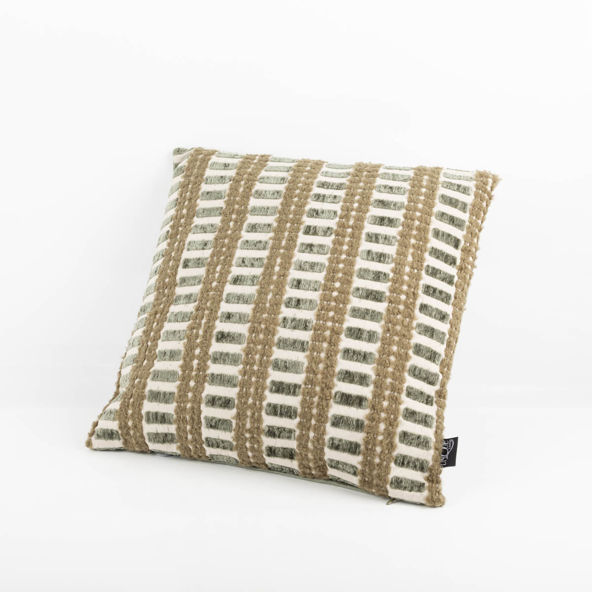 Durch das raffinierte Zusammenspiel von Struktur, Garnarten und Farben bringt Havana Dynamik und Behaglichkeit in deinen Wohnbereich. Die Rückseite in samtigem Uni-Grün rundet das Design ab und macht das Kissen flexibel einsetzbar.