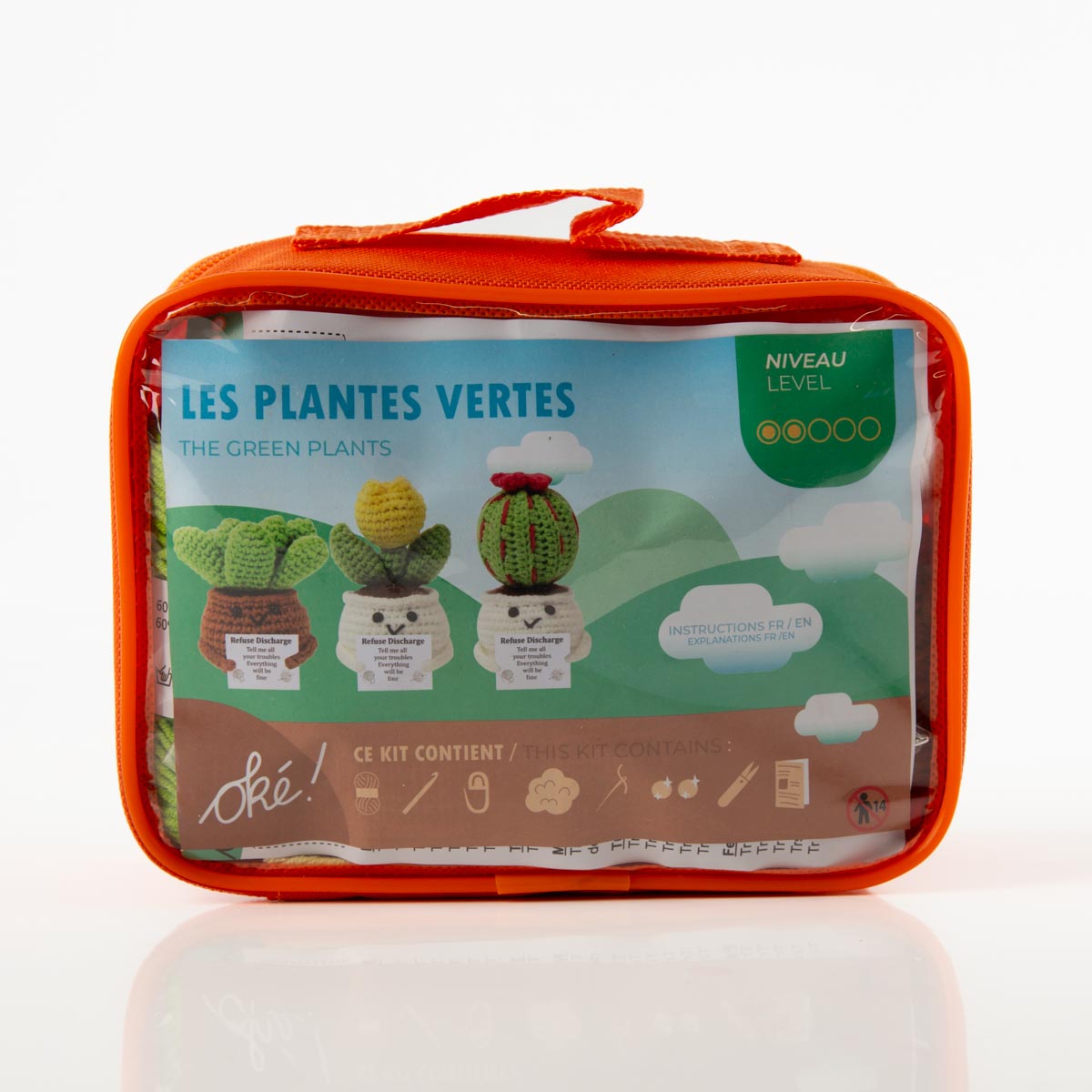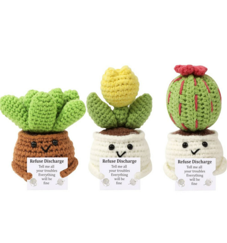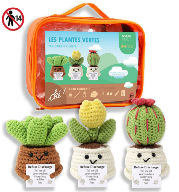 Das Set enthält alles, was du zum Häkeln brauchst – außer der Häkelnadel. Die drei verschiedenen Pflanzen sorgen für Abwechslung und machen das Projekt auch optisch besonders reizvoll. Der aufgedruckte Spruch „Refuse discharge – Tell me all your troubles – Everything will be fine“ verleiht den kleinen Pflanztöpfen eine positive Botschaft.