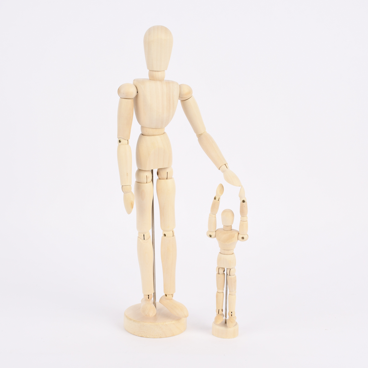 Dank der beweglichen Gelenke kann die Holzfigur in verschiedene Positionen gebogen werden und ist dadurch ideal, um das Zeichnen menschlicher Proportionen, Positionen und Gesten zu üben.