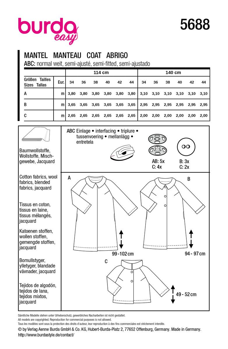 Burda Schnittmuster 5688 Damen Mantel