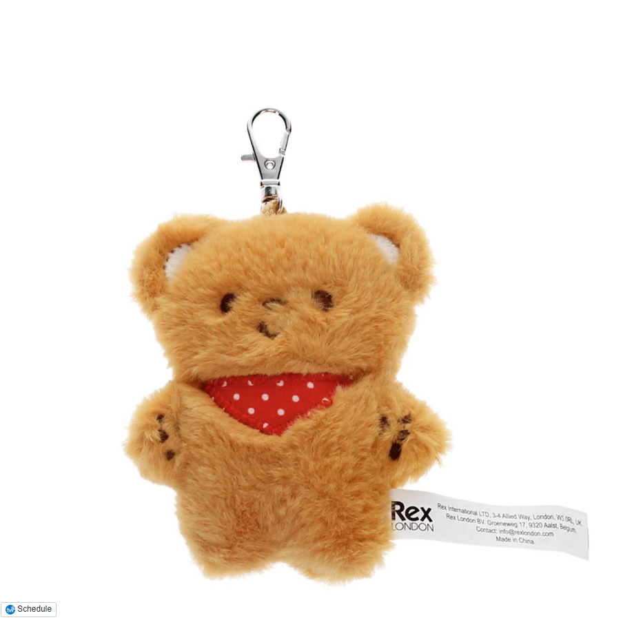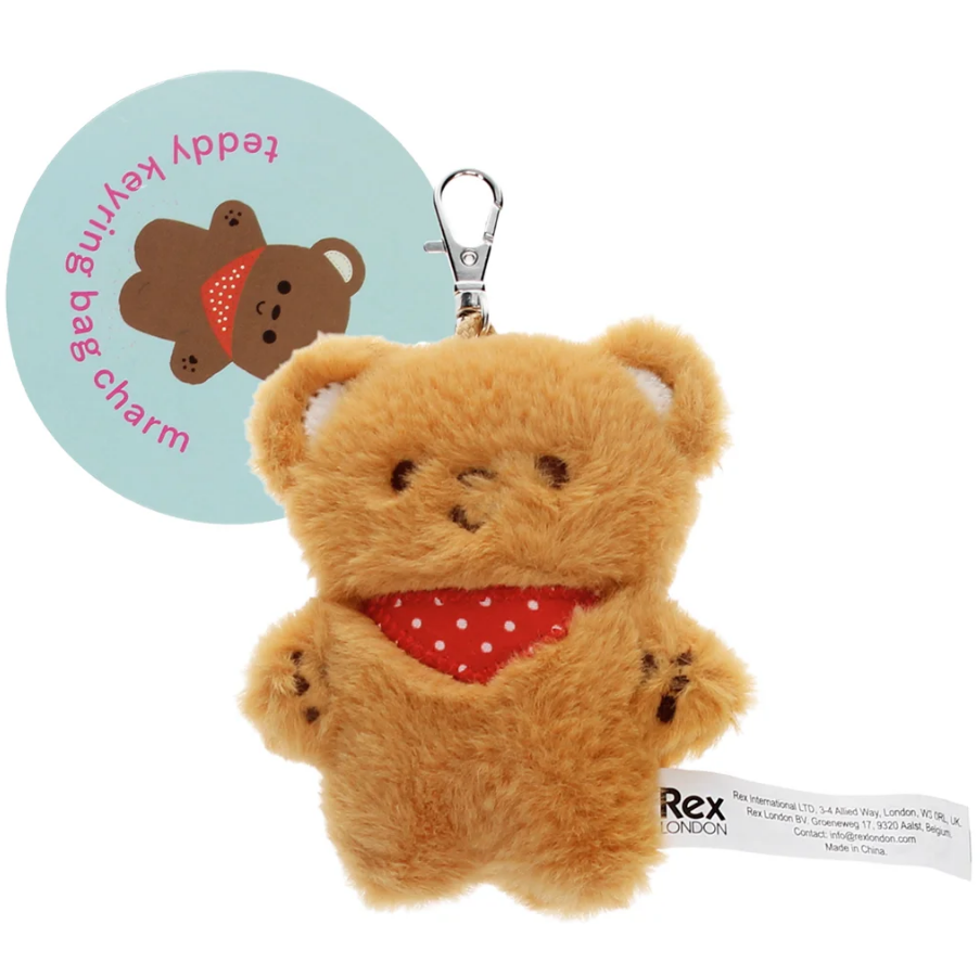 Flauschiger Schlüsselanhänger von Rex London in Form eines niedlichen Teddybären mit braunem Fell und rot-weißem Halstuch