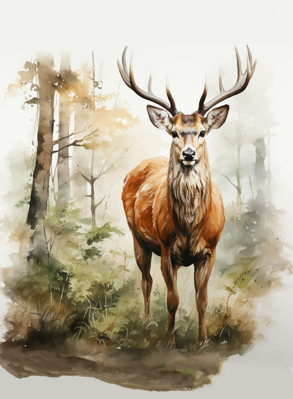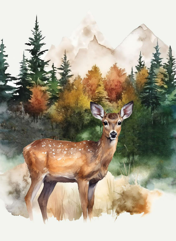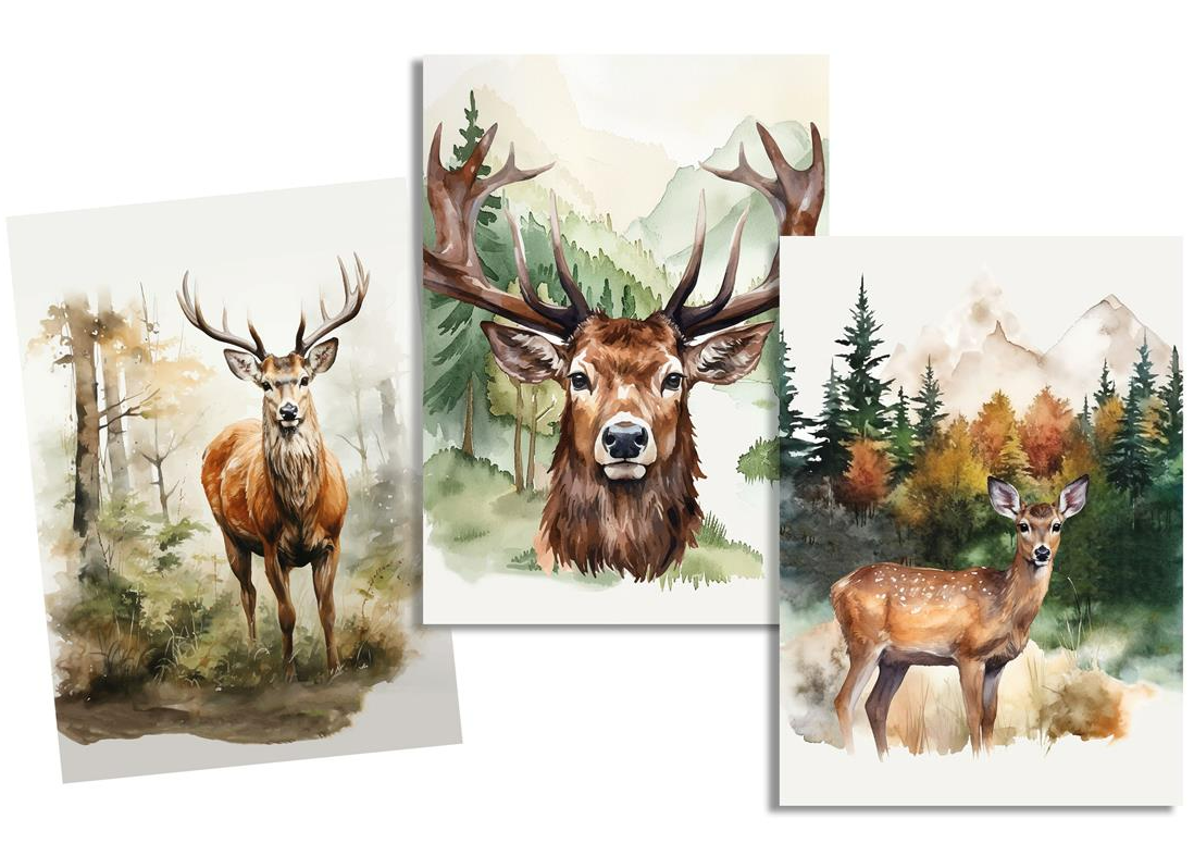 Im Set enthalten sind drei unterschiedliche Designs, die optisch perfekt zusammenpassen. Ein Motiv zeigt einen stehenden Hirsch im Wald, ein weiteres einen ausdrucksstarken Hirschkopf vor Berg- und Waldkulisse und das dritte ein Reh in einer stimmungsvollen Naturlandschaft. Zusammen ergibt das ein Set, das lebendig wirkt und dennoch ein einheitliches Gesamtbild schafft.