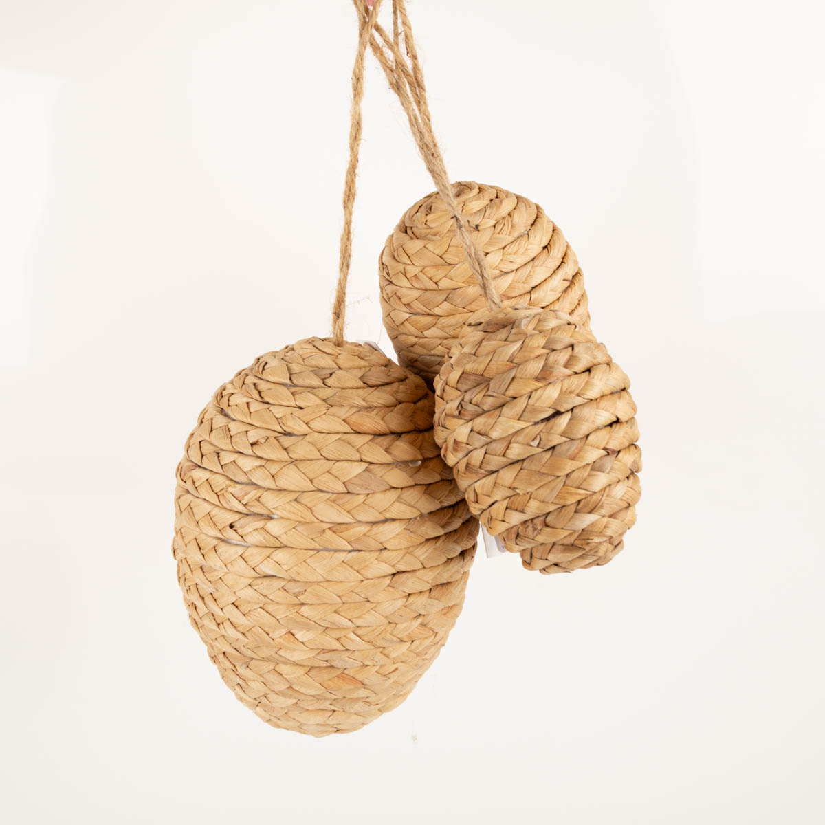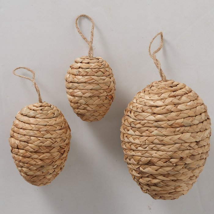 Mit diesem handgearbeiteten 3er Set bringst du natürliche Osterstimmung in dein Zuhause. Die Dekohänger in Eiform überzeugen mit ihrer warmen Naturfarbe, der geflochtenen Optik und einem ruhigen, harmonischen Look. Ob am Osterstrauch, am Fenster, an Zweigen oder als Teil deiner Frühlingsdeko: Diese Ostereier zum Hängen setzen schöne saisonale Akzente und passen wunderbar zu natürlichen Dekoideen.