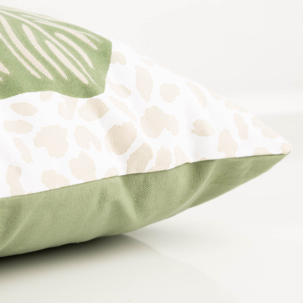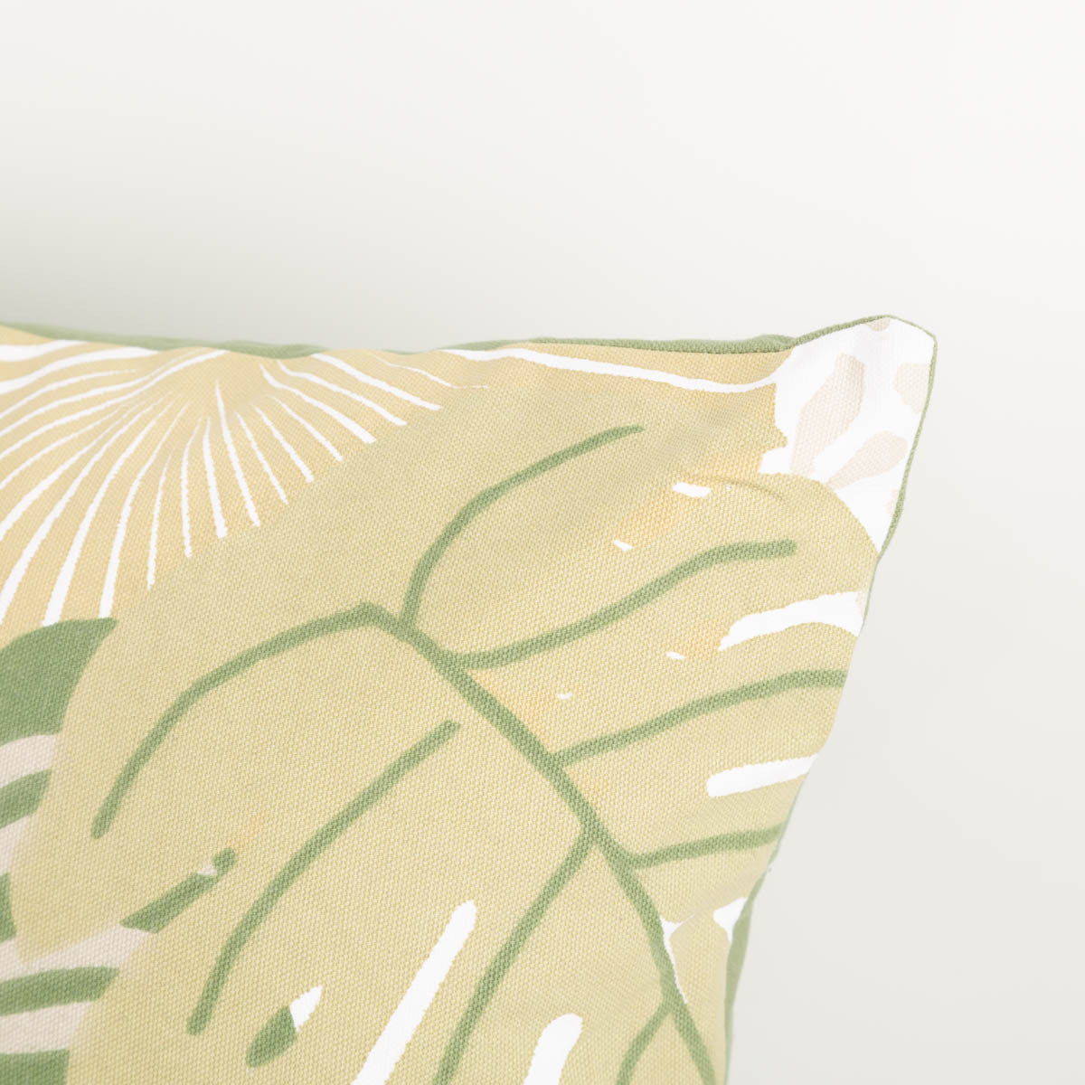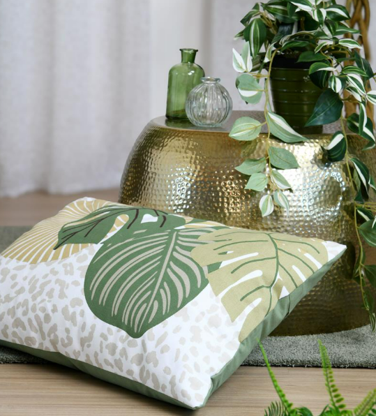 Die Kissenhülle besteht aus reiner Baumwolle und fühlt sich angenehm glatt und natürlich an. Die Vorderseite zeigt das dekorative Monstera-Blättermotiv, während die Rückseite bewusst ruhig gehalten ist: uni grün, mit praktischem Reißverschluss. So lässt sich das Kissen flexibel einsetzen und einfach handhaben.
