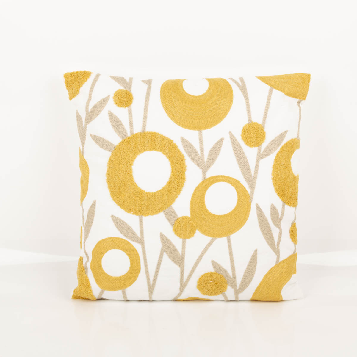 Das Muster interpretiert Blumen auf abstrakte Weise und verleiht dem Kissen damit einen frischen, zeitgemäßen Look. Runde Blütenformen in Gelb treffen auf beige Blätter und Stiele, wodurch ein klares und zugleich wohnliches Gesamtbild entsteht. Das Motiv wirkt dekorativ, aber nicht unruhig.