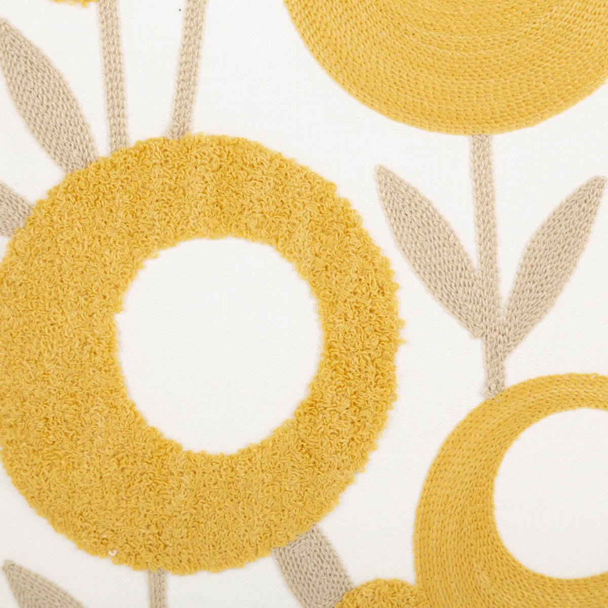 Ein besonderer Blickfang ist die tuftete Oberfläche der gelben Blütenelemente. Sie hebt einzelne Motivbereiche fühlbar hervor und sorgt für mehr Tiefe und eine spannende Materialwirkung. So wirkt das Kissen lebendiger als ein rein gedrucktes Muster und bekommt eine wertige, textile Ausstrahlung.