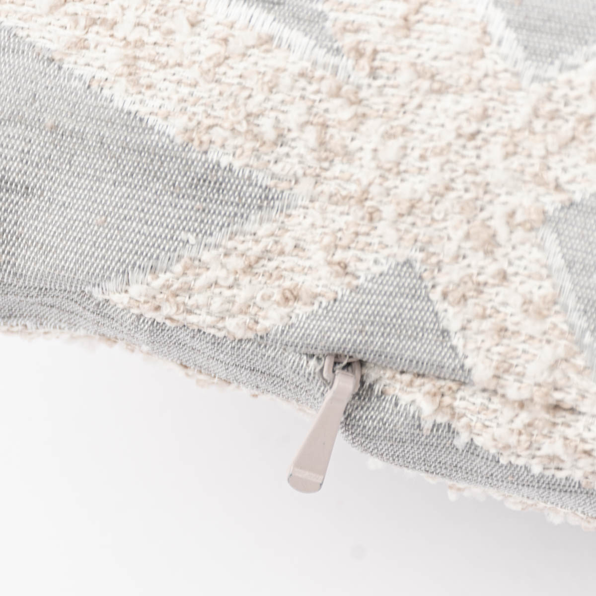 Das grafische Muster wirkt sehr modern und durch die unterschiedlichen Stoffarten, die hier aufeinandertreffen, hebt es sich besonders gut vom Grundgewebe ab. Typisch für Boucle sind die abstehenden, unterschiedlich großen Schlingen, Knötchen und Noppen, die für einen ausgesprochen mondänen Look sorgen. An der unteren Naht befindet sich der Reißverschluss, durch den eine Füllung aus Federn oder Kunstfasern eingefügt werden kann.