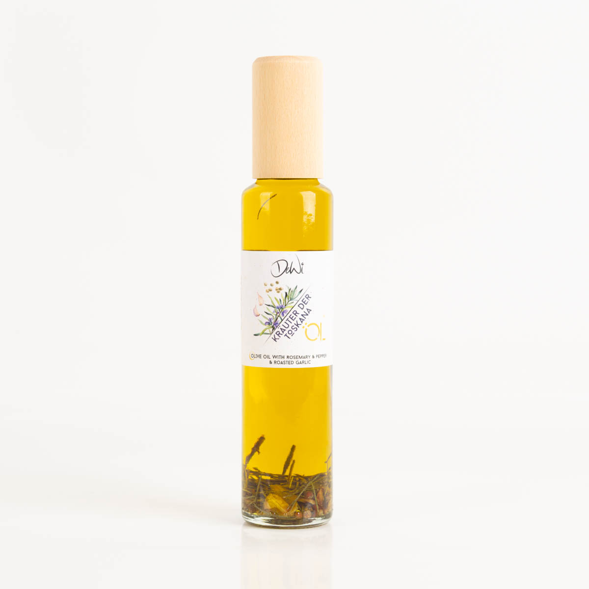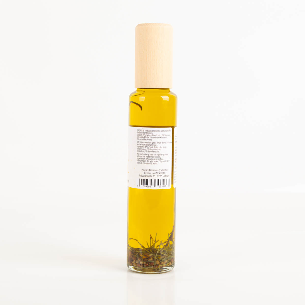 89% italienisches Olivenöl, 5% Rosmarin, 3% weisser Pfeffer, 2% gerösteter Knoblauch, natürliches Aroma