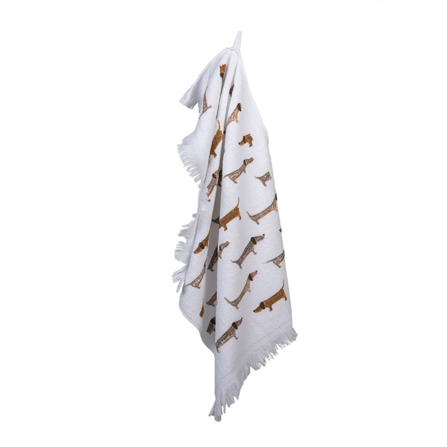 Das Design zeigt viele kleine Hunde in verschiedenen braunen und grauen Nuancen auf weißem Hintergrund. Das Motiv erinnert an Dackel und andere langgezogene Hundeformen und wirkt humorvoll, freundlich und dekorativ. Gerade für Hundefreunde ist dieses Handtuch eine schöne Ergänzung für den Haushalt.
