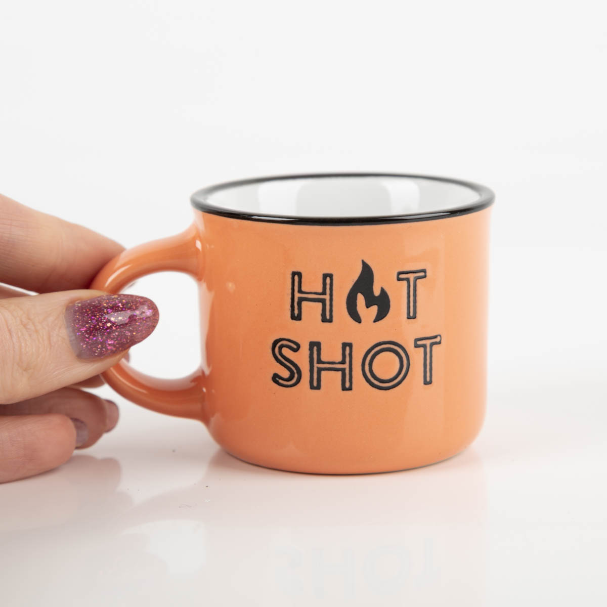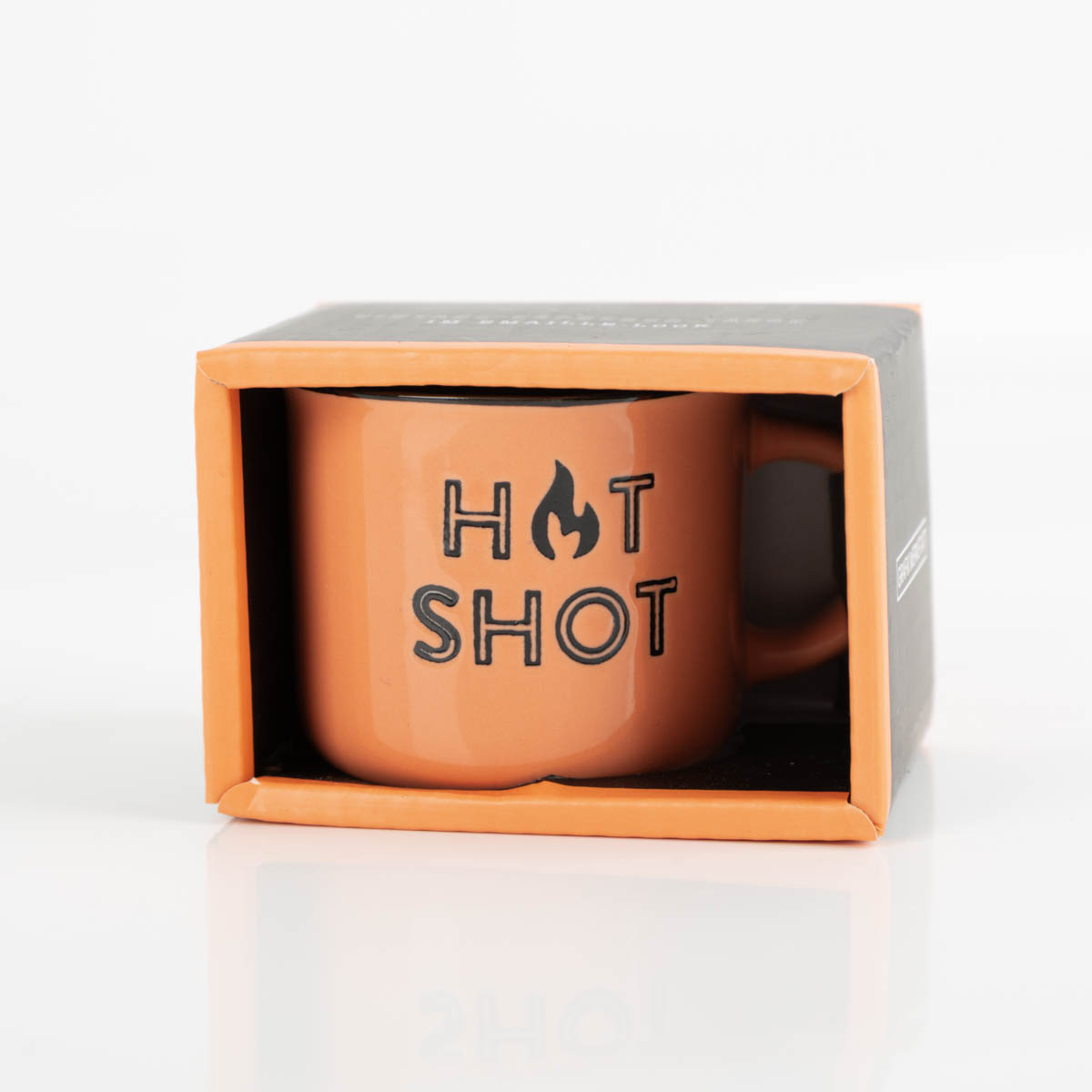 Die Espresso Tasse HOT SHOT von Grafik Werkstatt bringt Retro-Charme auf deinen Tisch! Mit ihrem nostalgischen Emaille-Look in strahlendem Orange und dem tiefgeprägten Schriftzug „HOT SHOT“ ist sie ein echter Hingucker für Espresso-Liebhaber.