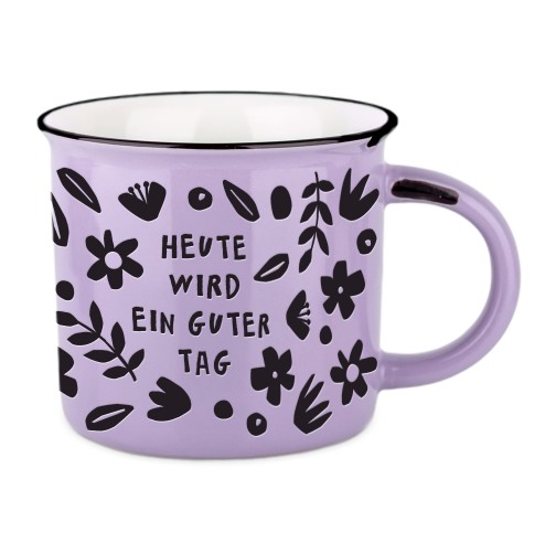 Die Vintage-Tasse „Heute wird ein guter Tag“ von Grafik Werkstatt ist das perfekte Geschenk, um einem besonderen Menschen Danke zu sagen. Der lilafarbige Keramikbecher im Emaille-Look fasst 400 ml und überzeugt mit stabilem Henkel sowie angenehmer Form. Der herzliche Spruch mit kleinem Herz macht jeden Schluck zum Lächeln-Moment.