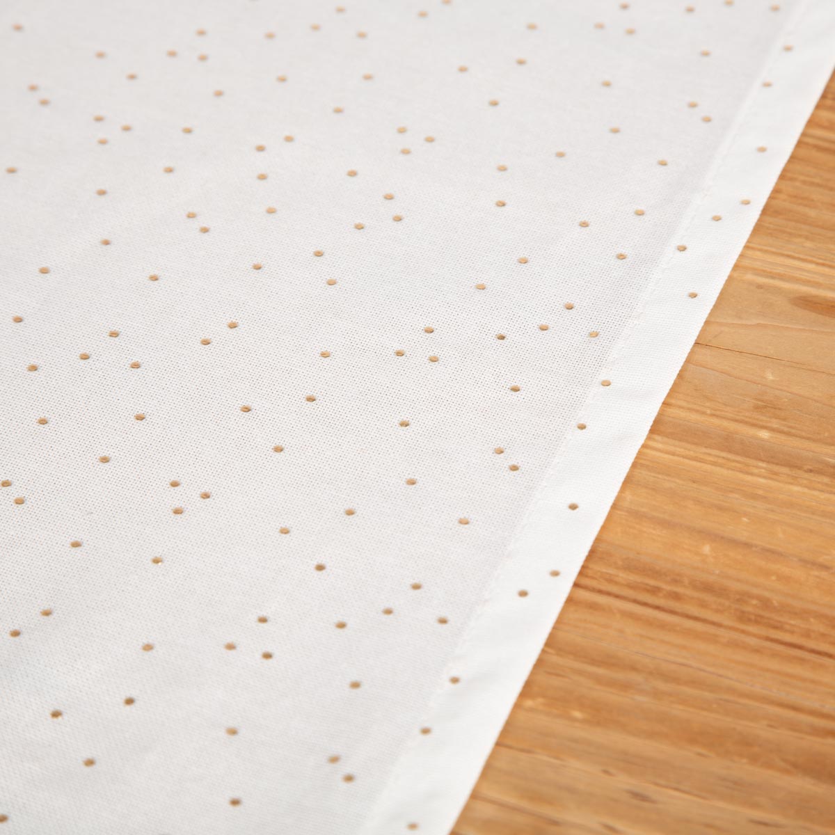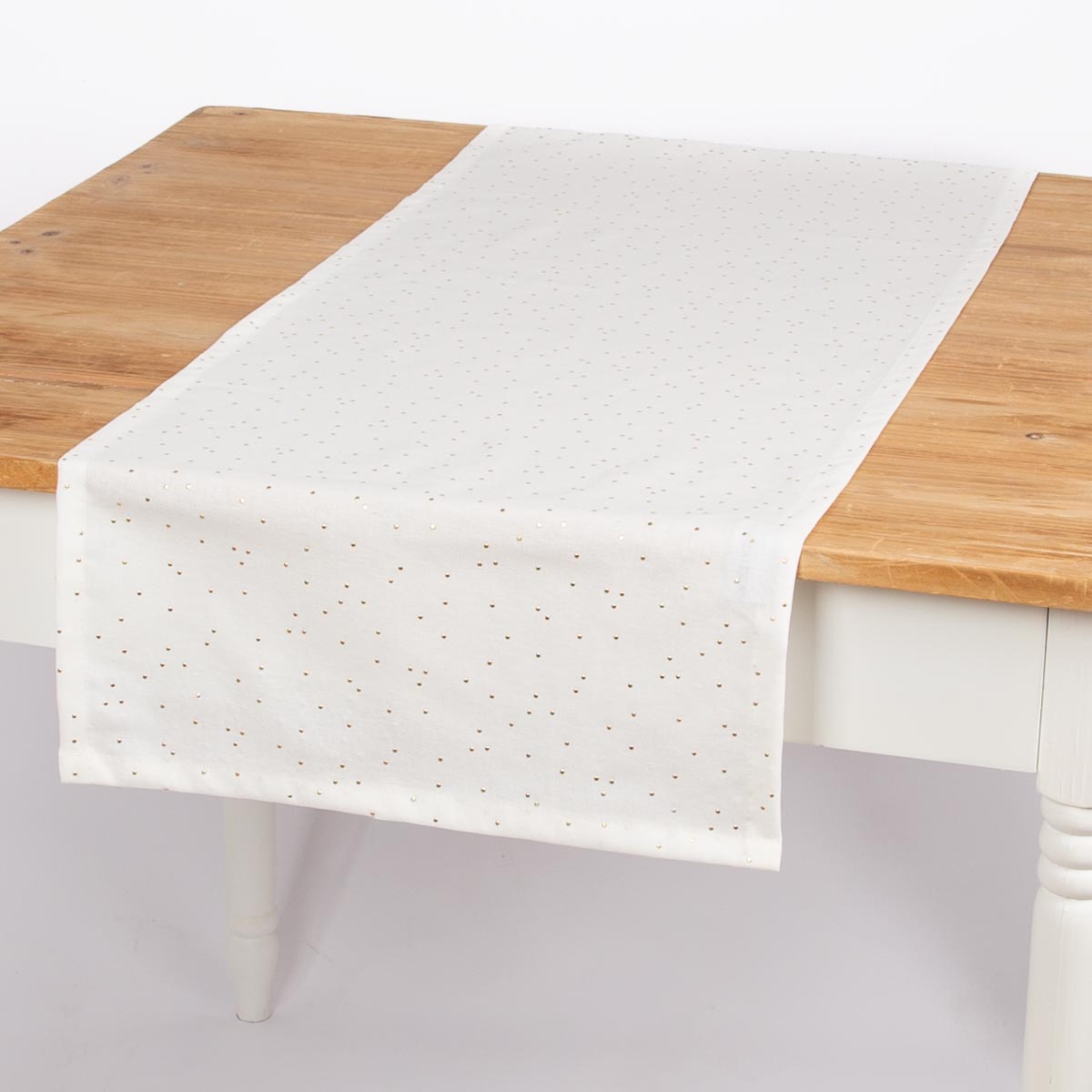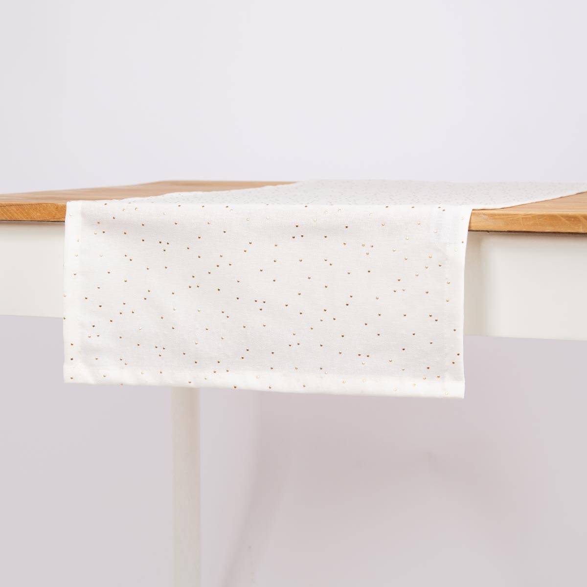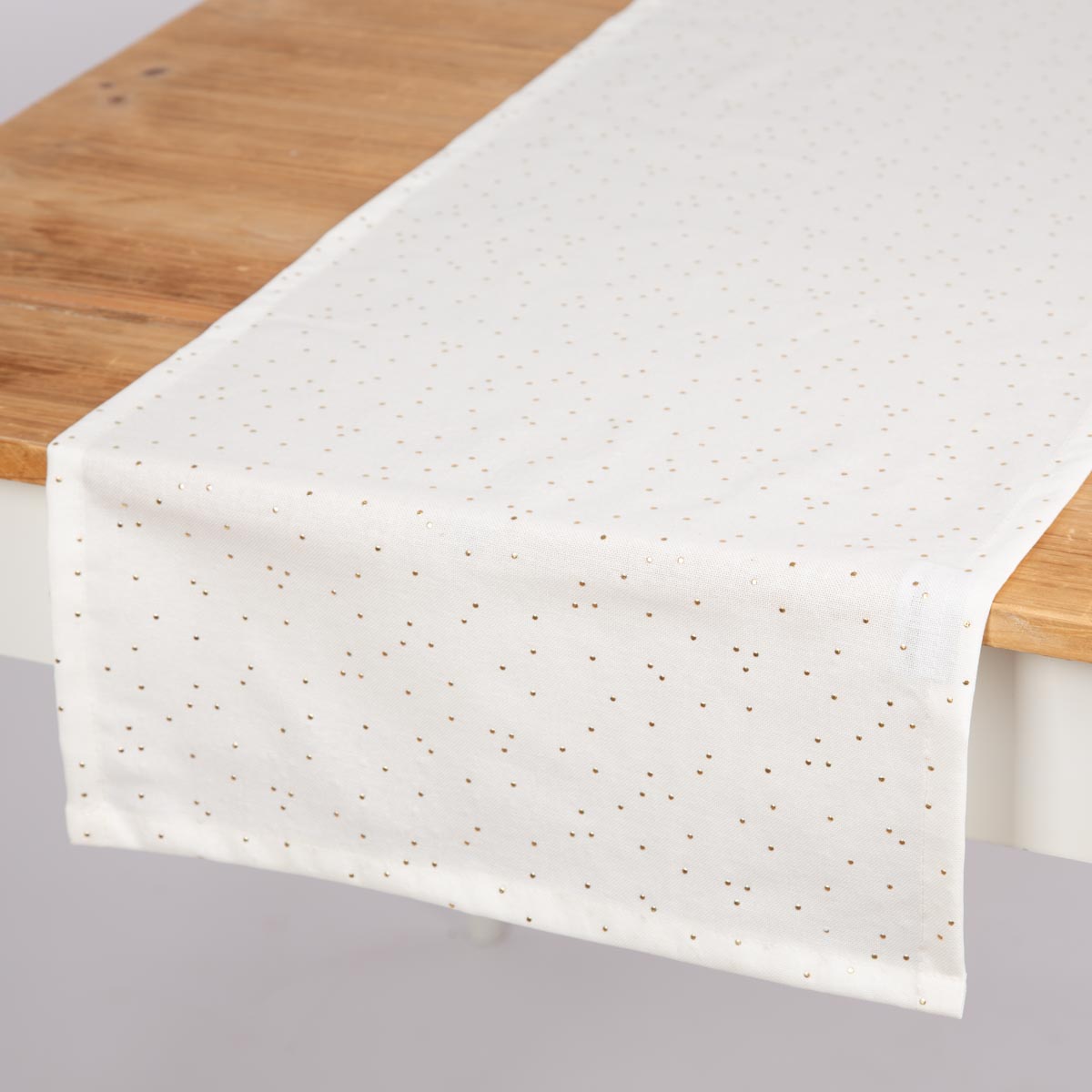 Elegantes Design: Weißer Tischläufer mit feinen goldenen Punkten für stilvolle Tischdekoration