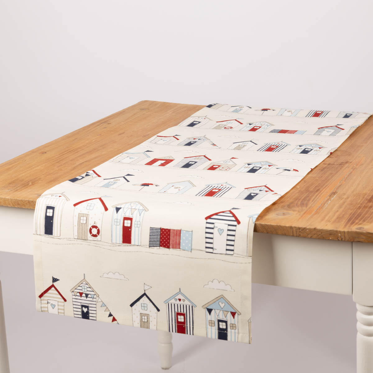 Tischläufer Baumwolle Beach Huts ecru blau rot 40x160cm von SCHÖNER LEBEN.
