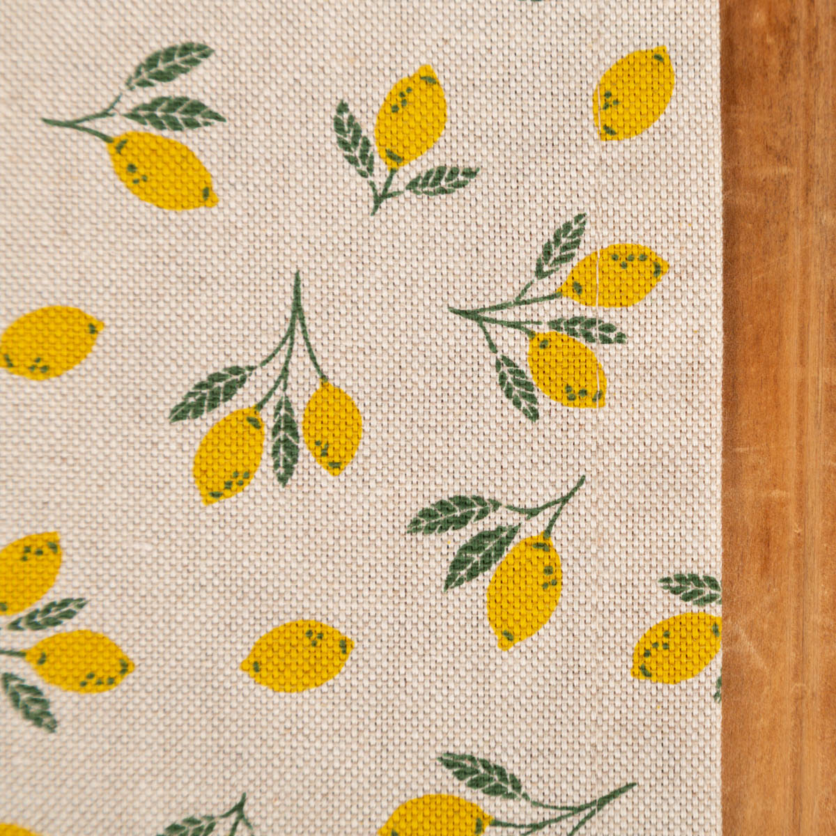 Die kleinen gelben Früchte mit grünen Blättern wirken lebendig und frisch auf dem hellen Grundstoff. Perfekt, um deinem Ess- oder Gartentisch ein sommerliches Flair zu verleihen.