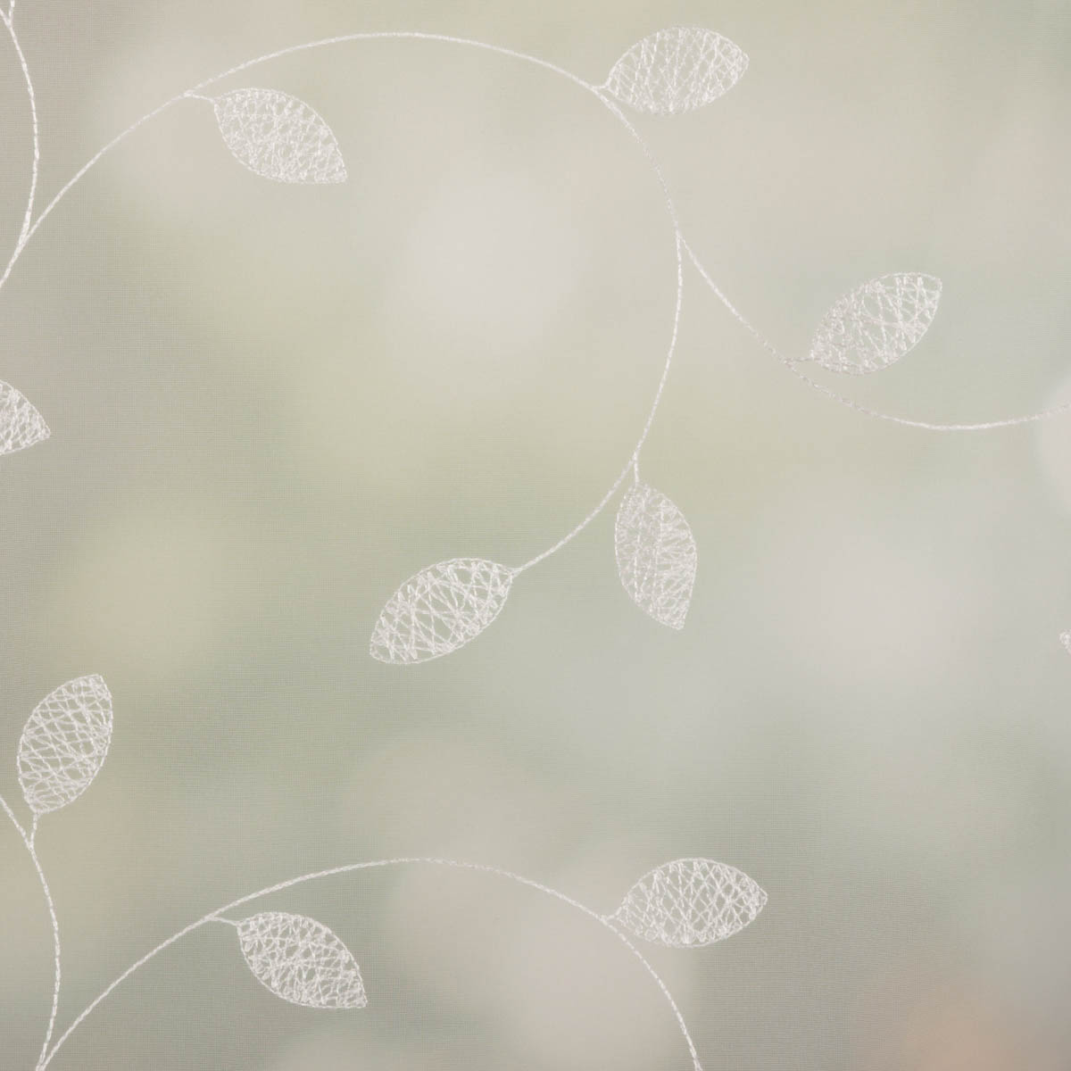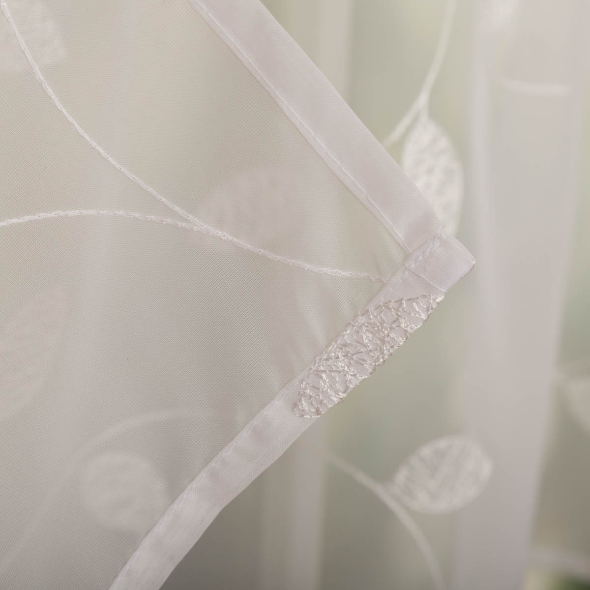 Die Gardine besteht aus leichtem, halbtransparentem Stoff, der für ein angenehmes Licht sorgt, ohne dabei zu viel Einblick zu gewähren. Die hochwertige Stickerei in Form feiner Blätter verleiht der Gardine einen edlen Touch – ganz ohne aufzutragen.