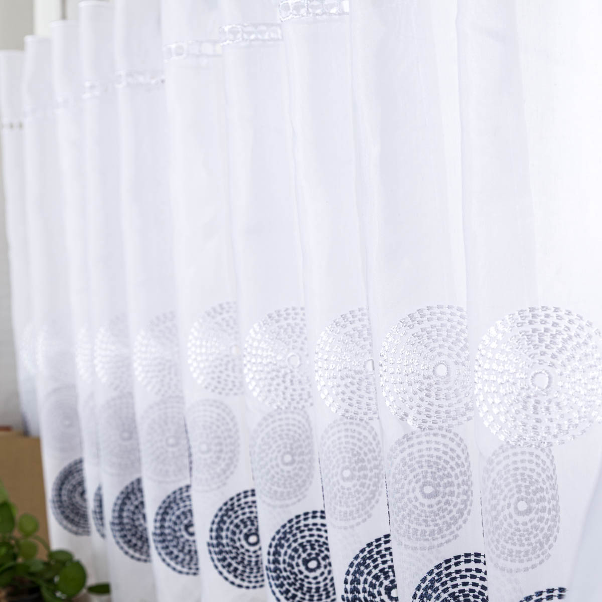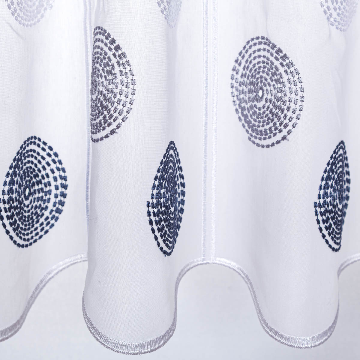 Diese hochwertige Scheibengardinen Meterware kombiniert zeitloses Design mit praktischer Handhabung. Der feine Voile in Weiß wird durch filigrane Stickerei-Kreise in Grau und Blau veredelt und fügt sich harmonisch in moderne Wohnstile ein. Der dekorative Wellenrand, die besonderen Aufhängelöcher und die elegante Hohlsaumstickerei verleihen der Scheibengardine eine edle Note.