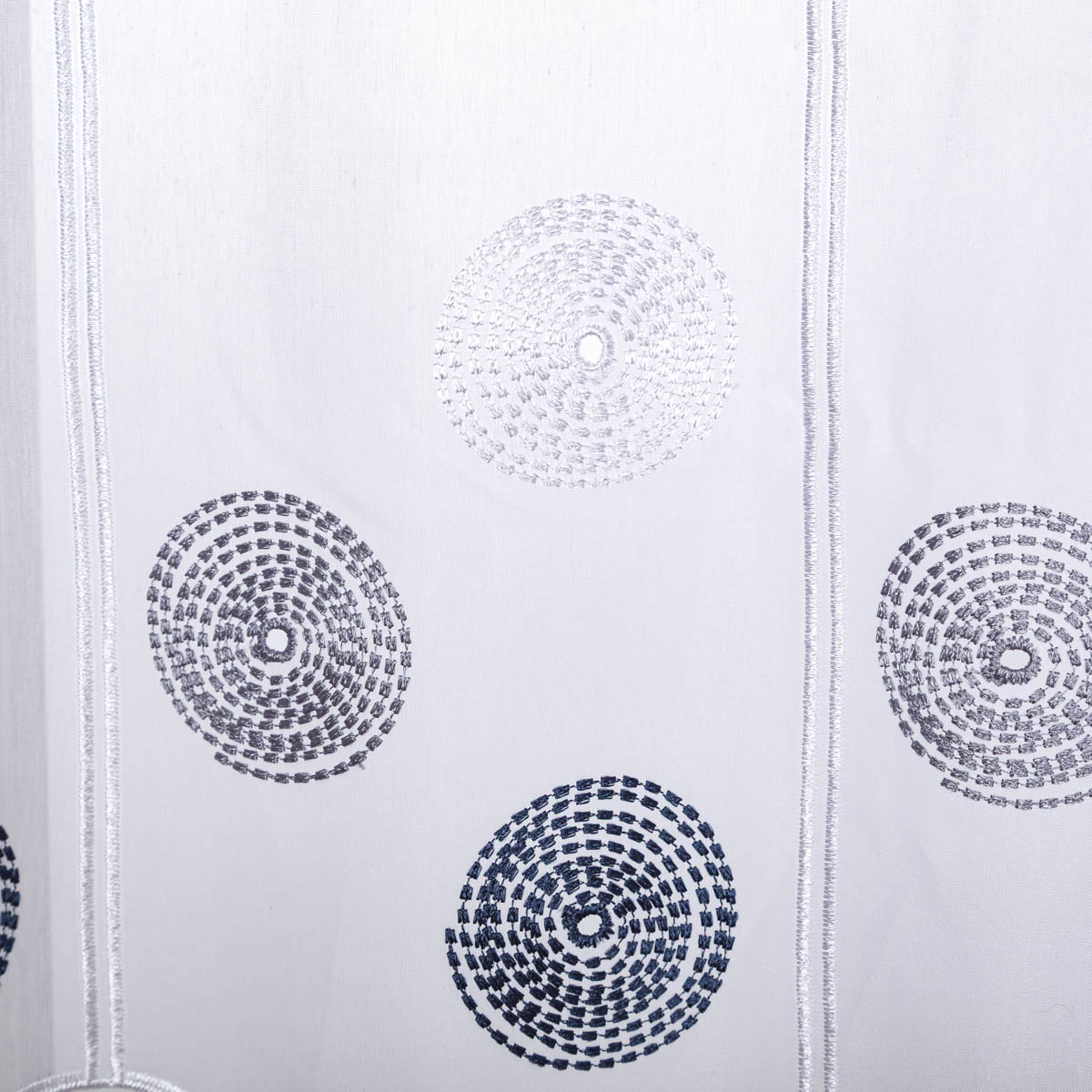 - Hochwertige Stickerei – modernes Kreis-Design in Grau und Blau auf feinem Voile in Weiß