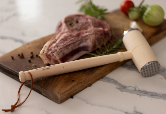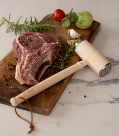 Das Set besteht aus einem Fleischthermometer für präzise Kerntemperaturen und einem Fleischklopfer mit Doppelkopf, mit dem auch festere Fleischstücke optimal vorbereitet werden können.