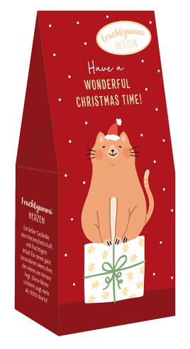 Diese leckeren Fruchtgummi-Herzen versüßen die Weihnachtszeit und sind ein perfektes Geschenk für alle Katzenfans! Die liebevolle Verpackung ist mit einer Weihnachtskatze und der goldveredelten Aufschrift “Have a wonderful christmas time!” gestaltet. Auf der Rückseite der schönen Verpackung ist Platz für deinen persönlichen Gruß! Die kleine Fruchtgummi-Nascherei mit einem Himbeersaftanteil von 24% ist richtig lecker!