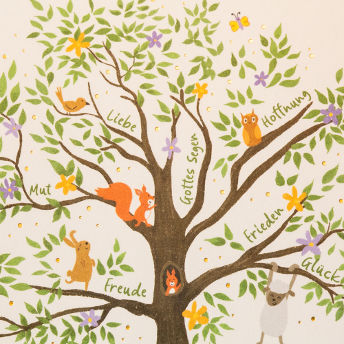 Auf den Ästen des Baumes findest du liebevoll illustrierte Tiere und positive Begriffe wie „Liebe“, „Mut“, „Freude“, „Hoffnung“, „Frieden“, „Glück“ und „Gottes Segen“. Diese Worte verleihen der Karte eine besondere Tiefe und transportieren gute Wünsche auf eine ganz besondere Weise.